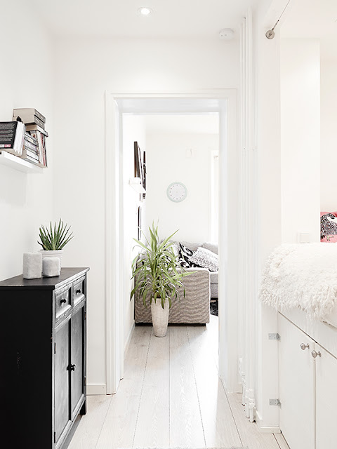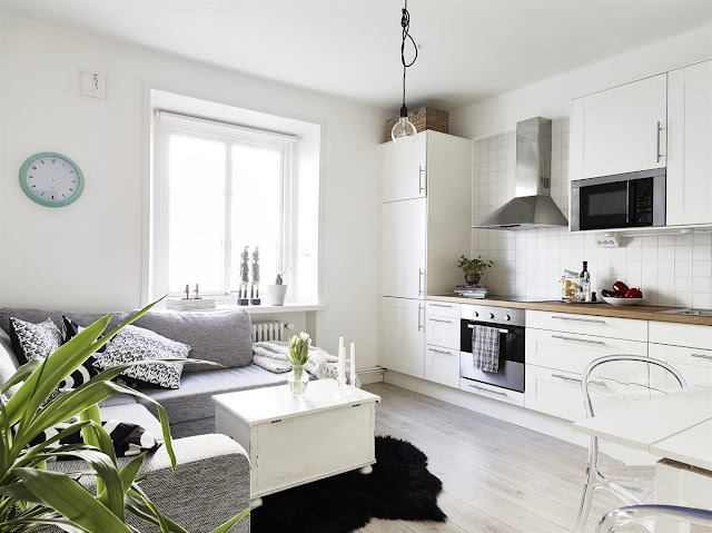 Dla niezdecydowanych polecam obejrzeć zdjęcia przedstawionej aranżacji – skandynawskiej kawalerki. Patrząc na zdjęcia pokoju, można odnieść wrażenie, że mieszkanie wcale nie jest takie małe. Zmieściła się tutaj szara tekstylna sofa, kolorowe dekoracje, aneks kuchenny: białe szafki, drewniany blat, a nawet stół. Pokój wydaje się być przestronny i jasny, pomimo tego, że ma tylko jedno okno. Natomiast łóżko umieszczono już trochę nietypowo, bo w korytarzu. Na małej przestrzeni każdy kreatywny pomysł na jej aranżację może się sprawdzić, o ile właściciele lub użytkownicy mieszkania czują się w nim dobrze!