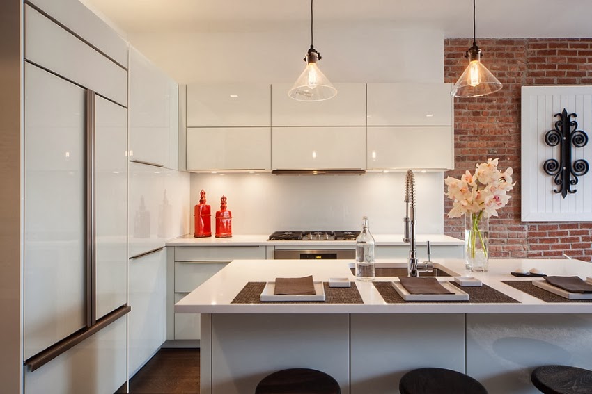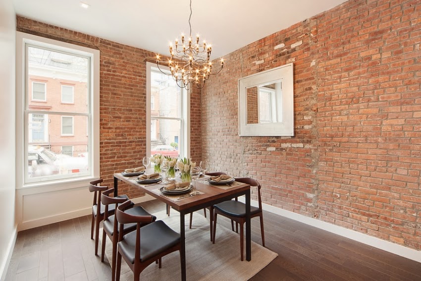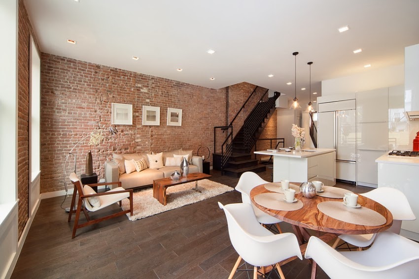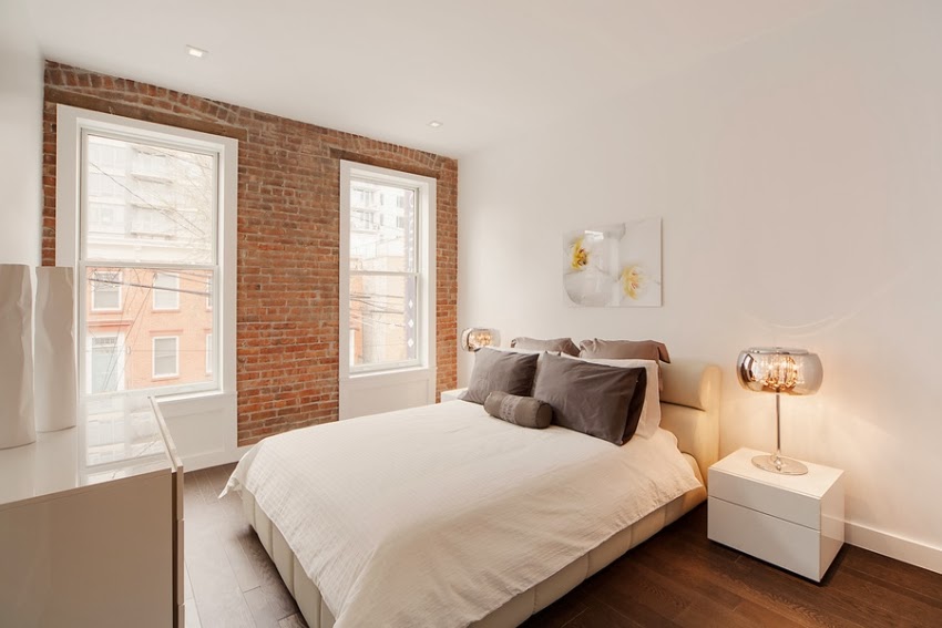Ceglane ściany w tym apartamencie idealnie pasują do zabudowy całego miasta, Nowego Yorku. Właśnie cegła określa tą przestrzeń, meble są w kolorach białych i beżowych. Przestronną przestrzeń podkreślono poprzez odpowiedni (minimalistyczny dobór mebli). Wnętrze jest wysokie, a okna charakterystyczne dla budynków położonych w dużych miastach w USA, czyli długie i wąskie.