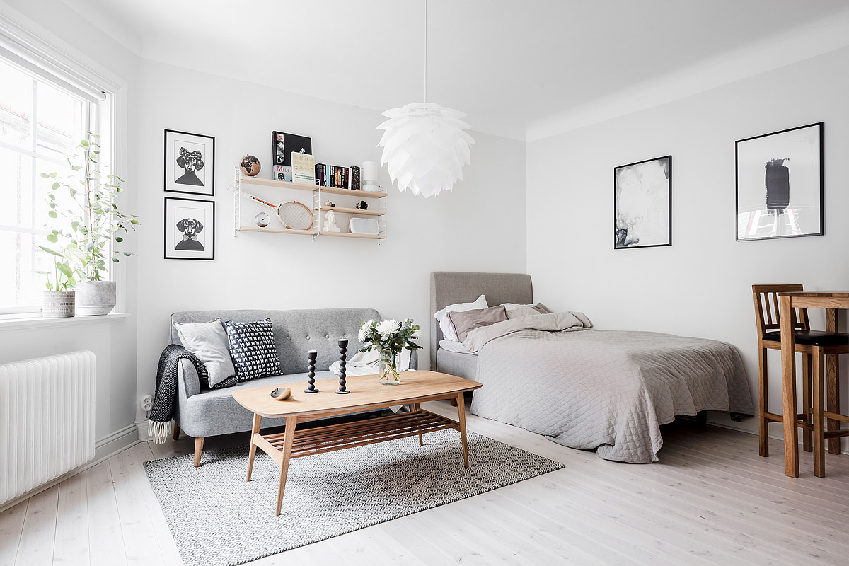 Bardzo mało miejsca do przechowywania. Nierealne w codziennym życiu. Chyba że to mieszkanie dla studenta. Łóżko oddzieliłabym np. zasłonką lub parawanem.