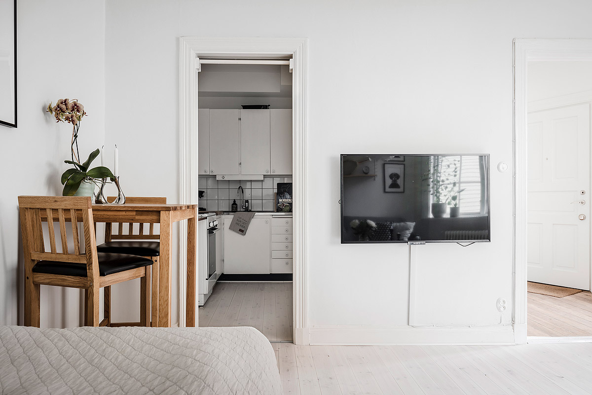 Białe ściany, podłoga w kolorze drewna, na środku biały żyrandol. Z pokoju dziennego przechodzi się do aneksu kuchennego. Nie ma w nim okna, jednak dzięki przewagi bieli udało się stworzyć ciekawą przestrzeń do prac kuchennych.