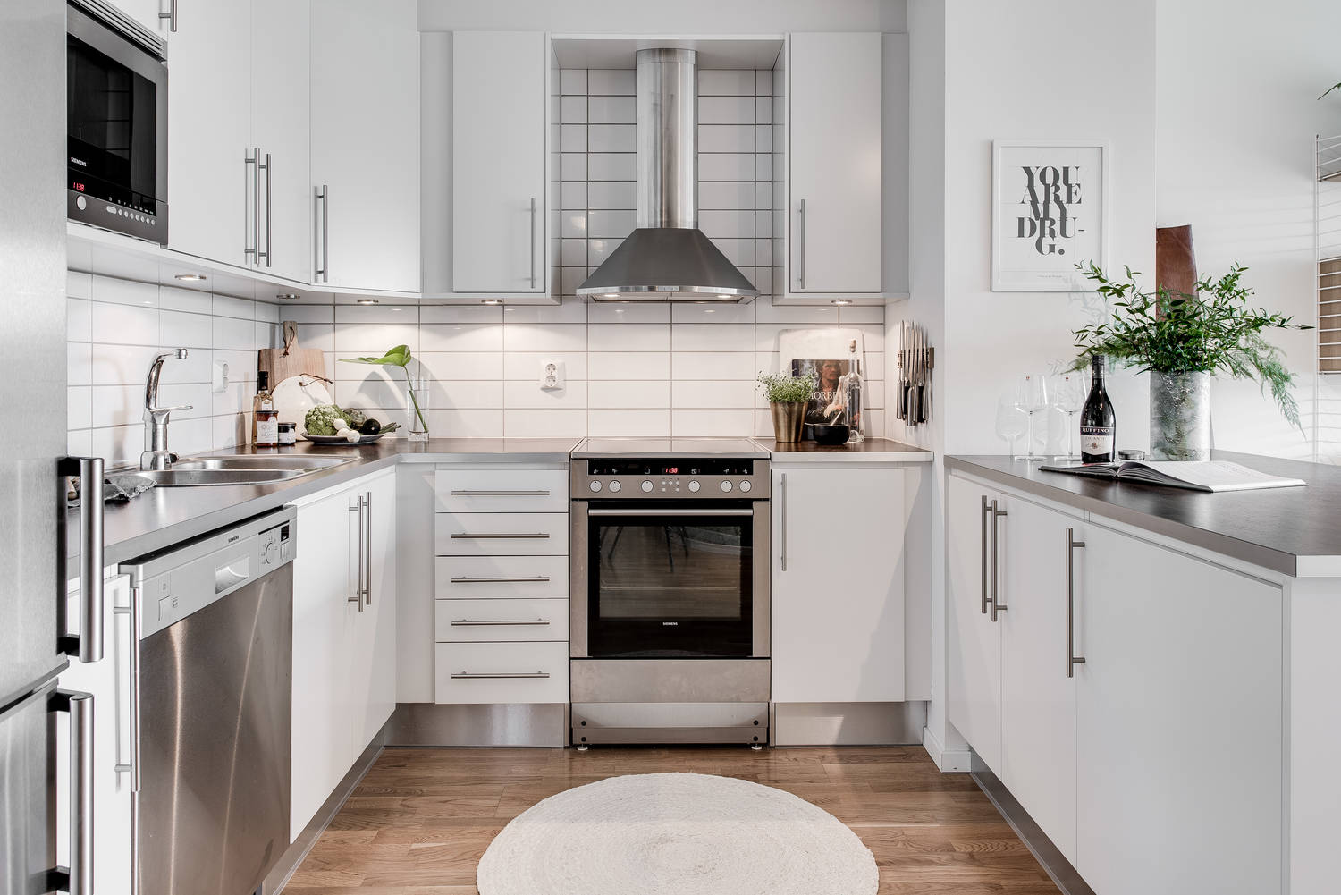 Aneks kuchenny z przewagą bieli: szafki kuchenne, płytki oraz aluminiowe Agd. Aneks kuchenny łączy z częścią odpoczynkową stół z tapicerowanymi krzesłami oraz regał z dekoracjami.