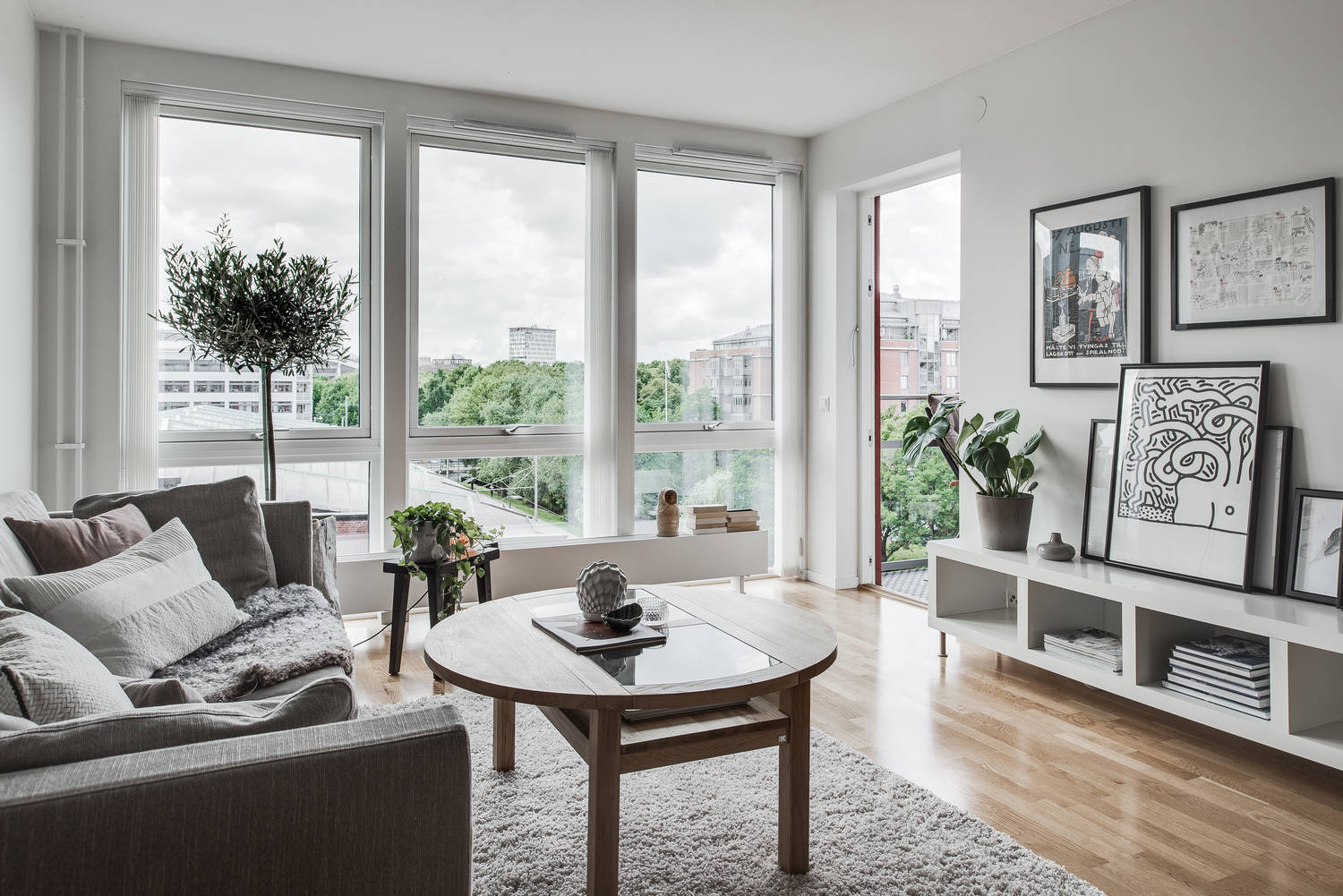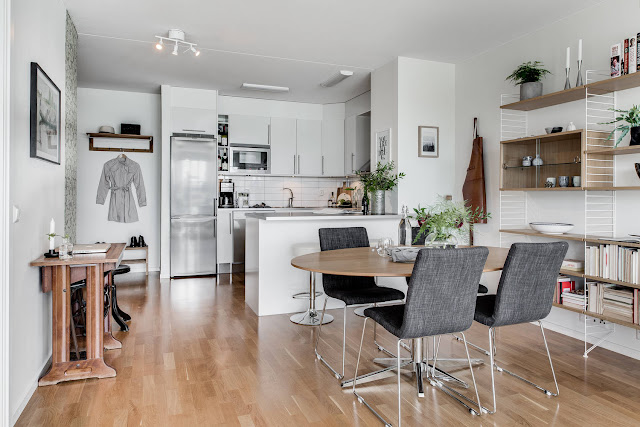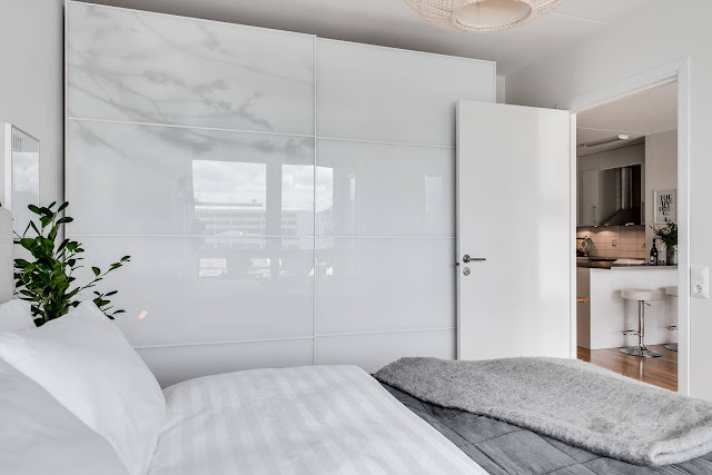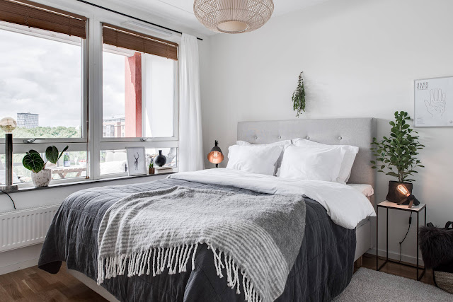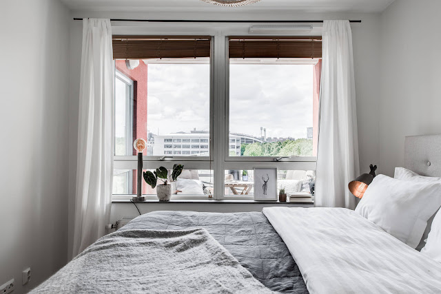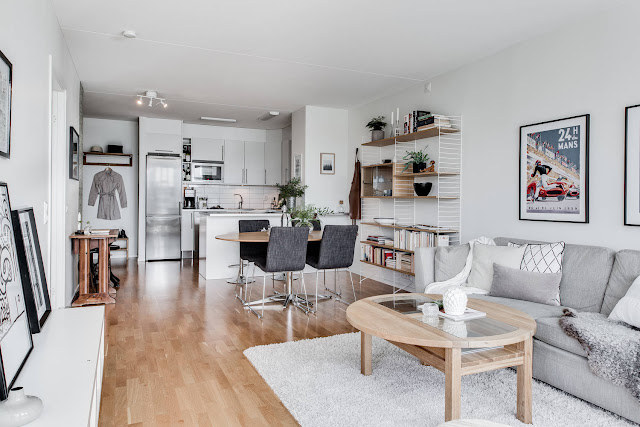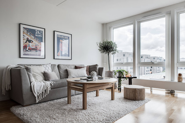 Mieszkanie w nowym bloku w szwedzkim mieście. Dwa pokoje, w tym pokój dzienny z aneksem kuchennym oraz sypialnia. Piękne duże okna wprowadzają do wnętrza ogrom światła. Aranżacja w bardzo klasycznej kolorystyce: szara sofa ocieplona miękkimi poduszkami, nad nią powieszone grafiki w czarnych ramach, stoliki drewniane oraz delikatne kwiaty i książki, czyli przez niektórych zapomniane przedmioty które zawsze dobrze świadczą o właścicielach wnętrza!