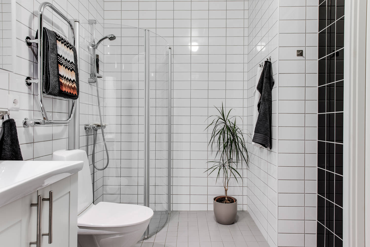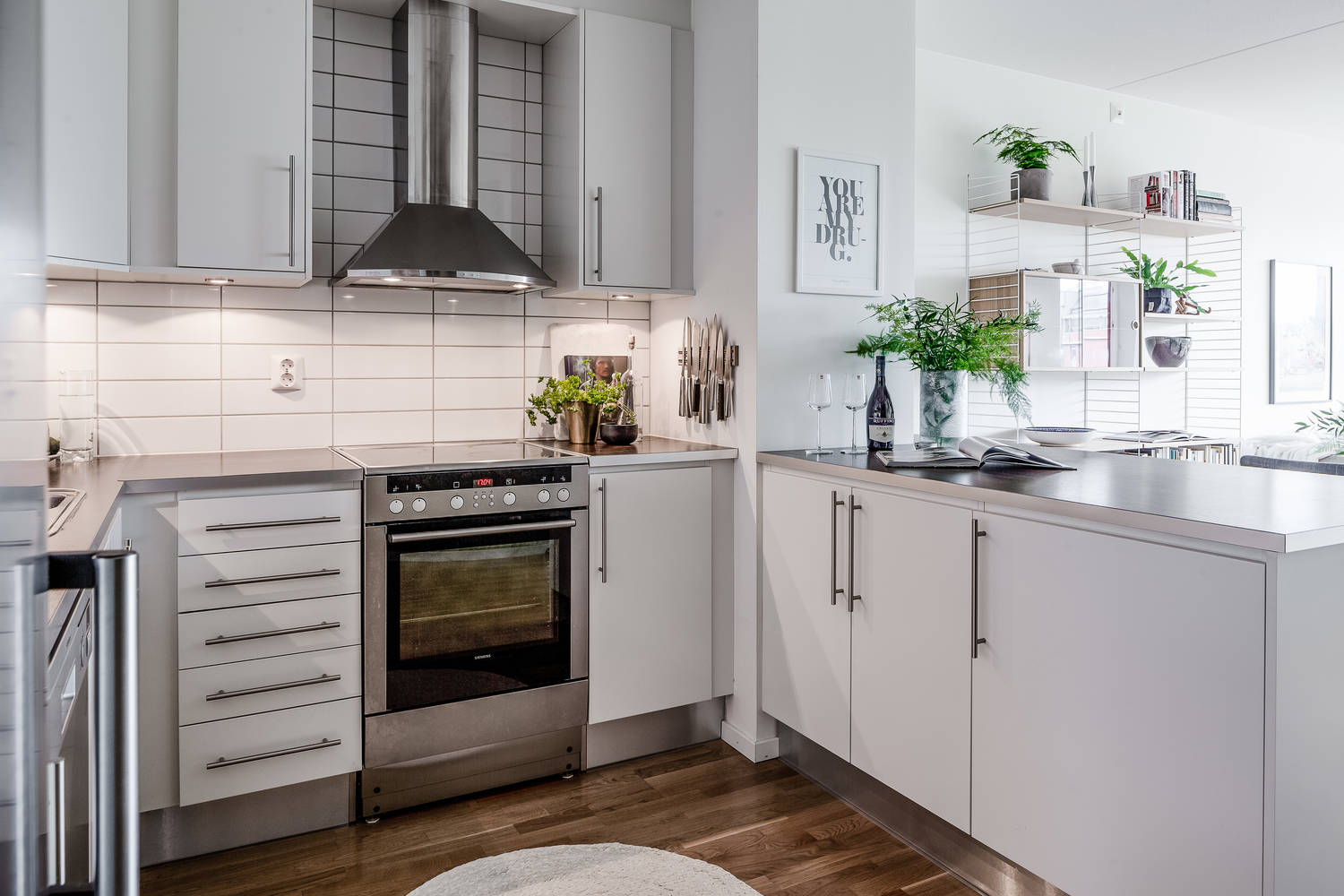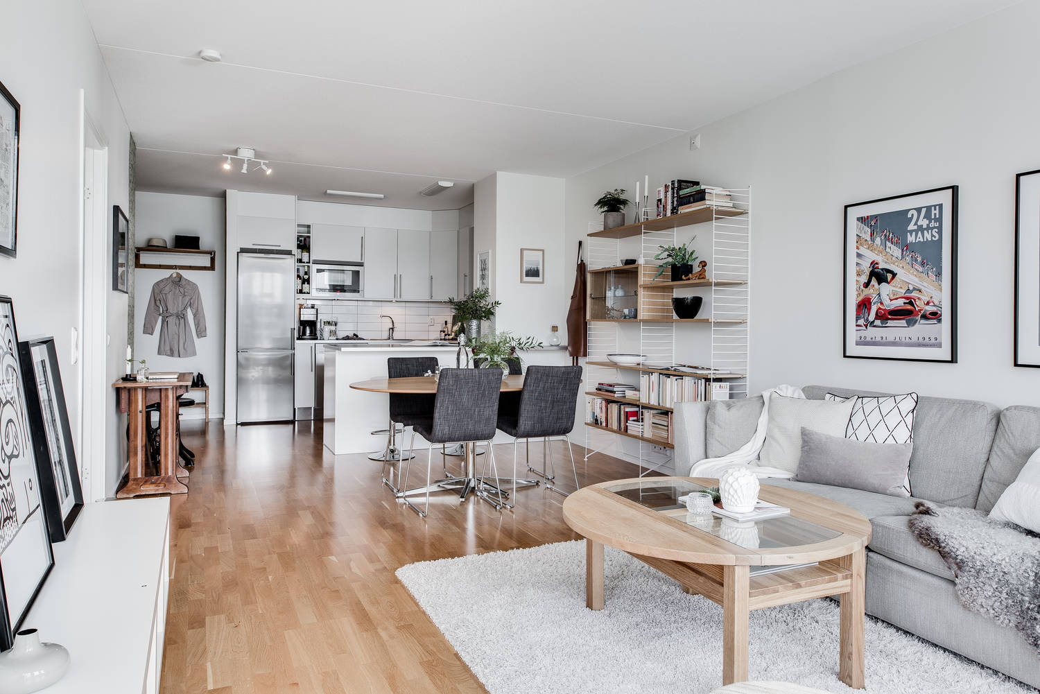 Mieszkanie w nowym bloku w szwedzkim mieście. Dwa pokoje, w tym pokój dzienny z aneksem kuchennym oraz sypialnia. Piękne duże okna wprowadzają do wnętrza ogrom światła. Aranżacja w bardzo klasycznej kolorystyce: szara sofa ocieplona miękkimi poduszkami, nad nią powieszone grafiki w czarnych ramach, stoliki drewniane oraz delikatne kwiaty i książki, czyli przez niektórych zapomniane przedmioty które zawsze dobrze świadczą o właścicielach wnętrza!