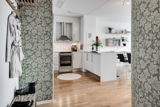 Przedpokój ozdobiony tapetą w kolorowe kwiaty. Znalazło się tutaj także miejsce na szafę, wieszak oraz stojak na buty.