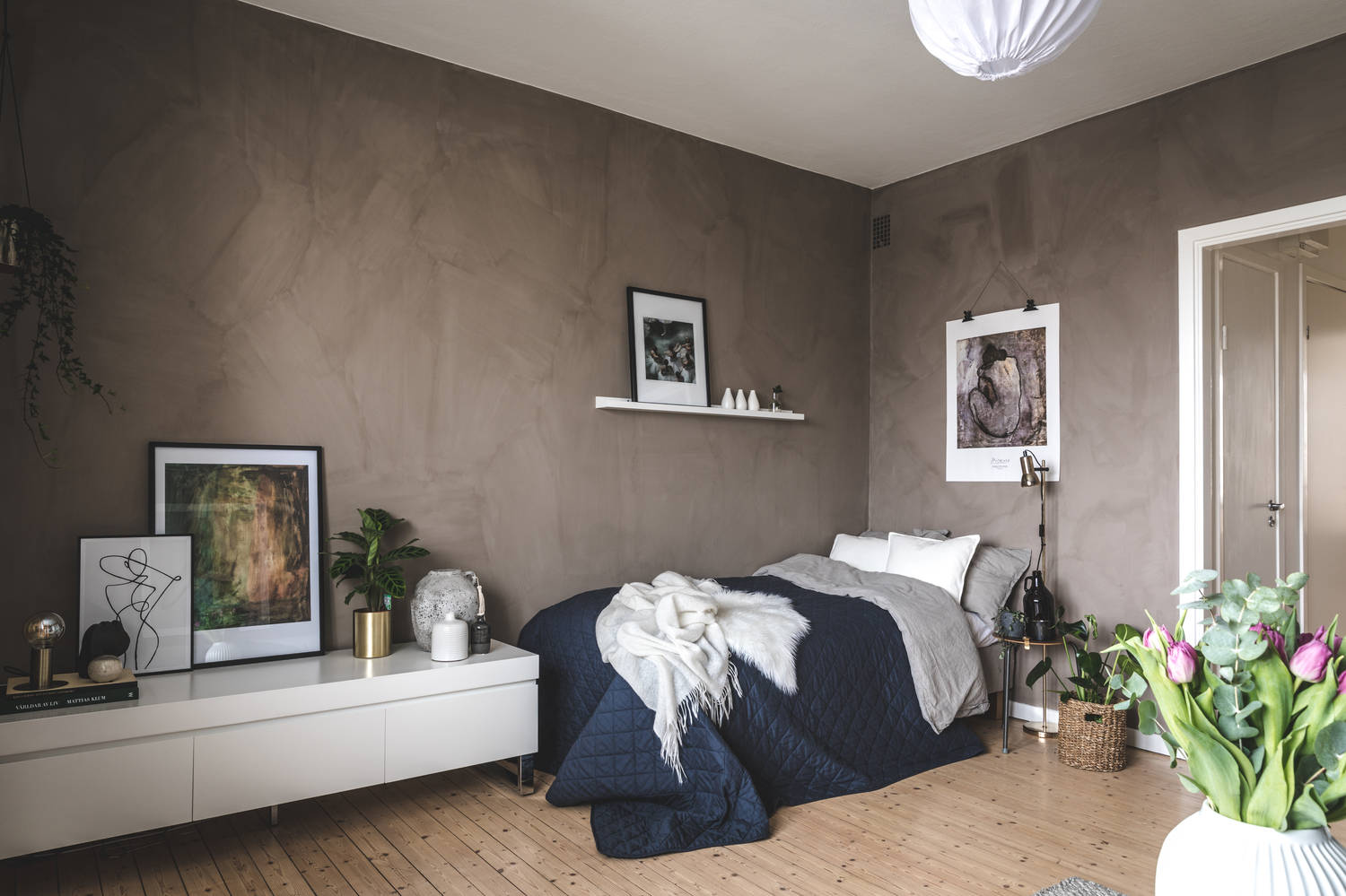 Aranżacja 37m2 kawalerki jest minimalistyczna, aczkolwiek ściany zostały pomalowane na oryginalny kolor. Przeważnie w małych pomieszczeniach stosuje się biel, która optycznie powiększa wnętrze. Tutaj zdecydowano się na brąz i to z unikatowym efektem przecierania!