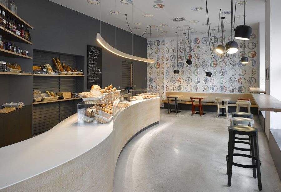 Aranżacja wnętrza kawiarni prosto ze stolicy Czech, Pragi. Wejście do kawiarni jest „od ulicy”, pomieszczenia łączą przestrzeń do picia kawy, piekarnię oraz bistro.