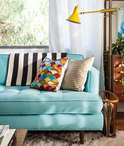 Błękitna sofa w roli głównej – oryginalny wystrój wnętrz