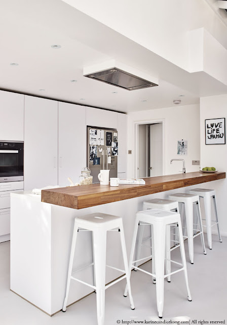 Co myślicie o tym fantastycznym projekcie blogerki Karine z bloga karinecandicekong.com (polecam odwiedzić tą stronę – piękne inspiracje z aranżacji wnętrz, stylizacji, podróży i sztuki). Ja jestem nim zachwycona, białe szafki kuchenne połączone z białym i drewnianym blatem, do tego świetne biało – czarne plakaty z napisami „You are loved” czy „Love, Life & Family”. Taborety / hokery w skandynawskim stylu, minimalistyczne dodatki oraz piękne duże okna świetnie uzupełniają ten projekt.