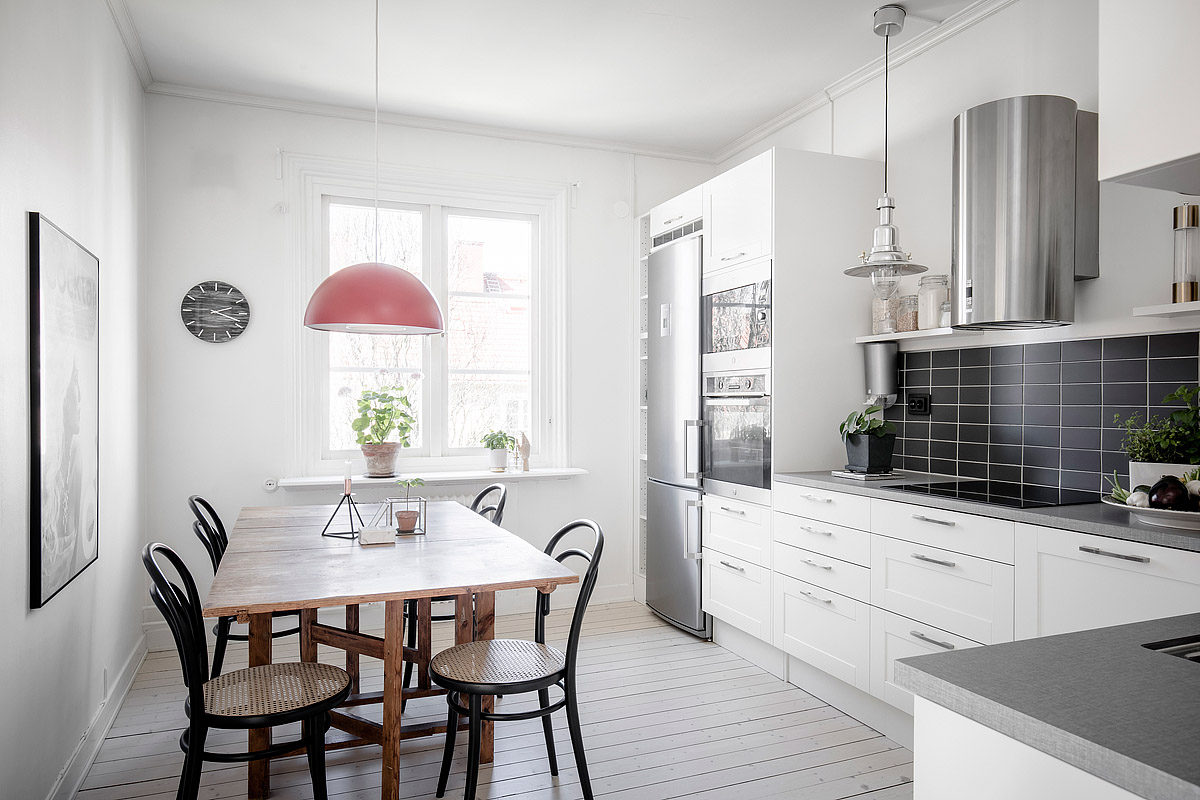 Świetnie urządzona kuchnia, bardzo mi się podoba. Czarne płytki fajnie przełamują biel kuchni, a czerwony żyrandol pięknie się wyróżnia i zwraca na siebie uwagę. Jestem jednak zwolenniczką niezabudowywania sprzętów AGD, zdecydowanie wolę lodówki, piekarniki i zmywarki wolnostojące, ale to tylko moje preferencje.
