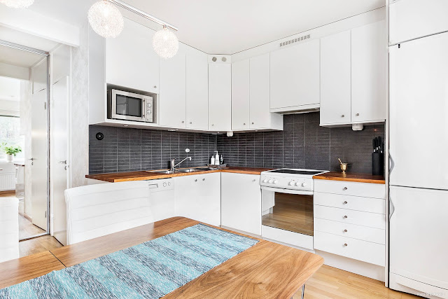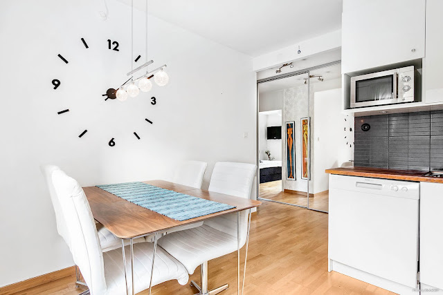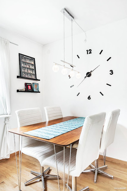3) Białe szafki kuchenne z drewnianym blatem. Pomiędzy szafkami położono ciemne płytki naścienne. Stół prostokątny z czterema krzesłami. Siedziska bardziej mi przypominają biurowe niż kuchenne:) Na ścianie powieszono duży zegar.