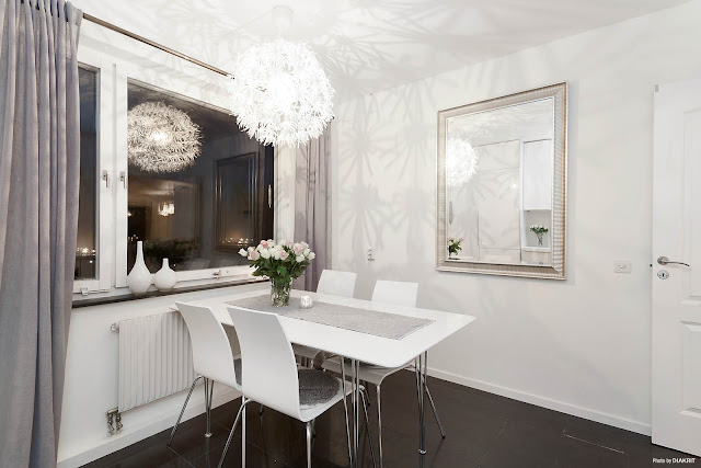 1) białe szafki kuchenne oraz stół i krzesła., ciemna podłoga oraz szare zasłony zawieszone na oknach. Dominuje biel, ale aby nie było zbyt chłodno wnętrze ożywiono ciętymi kwiatami, oraz lustrem w ozdobnej ramie …