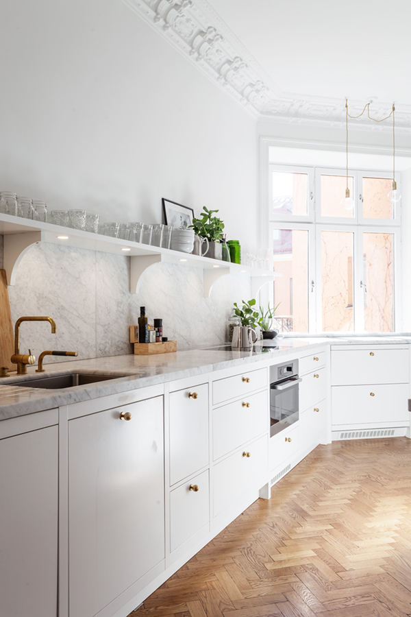 Przy białych kuchniach zawsze jest to ryzyko, że może sprawiać takie surowe, "kliniczne" wrażenie – ale tu nie ma o tym mowy, bo dodatki nadają wnętrzu ciepła i charakteru. Piękna aranżacja!