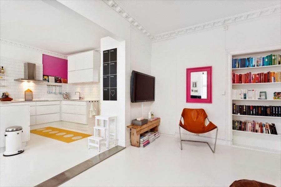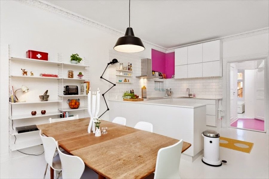 Mieszkanie położone jest w Oslo i należy (lub należało, bo zostało wystawione na sprzedaż) do blogerki Jeg Er Jonathan. Ściany pomalowane są na biało, ale w różnych miejscach zaskakują nas kolorystyczne akcenty, takie jak pomalowany kawałek ściany na kolor fuksja w aneksie kuchennym lub różowe lustro. Według mnie w tym projekcie można odnaleźć zarówno styl skandynawski, jak i nowoczesny z dbałością o prostotę i minimalizm.