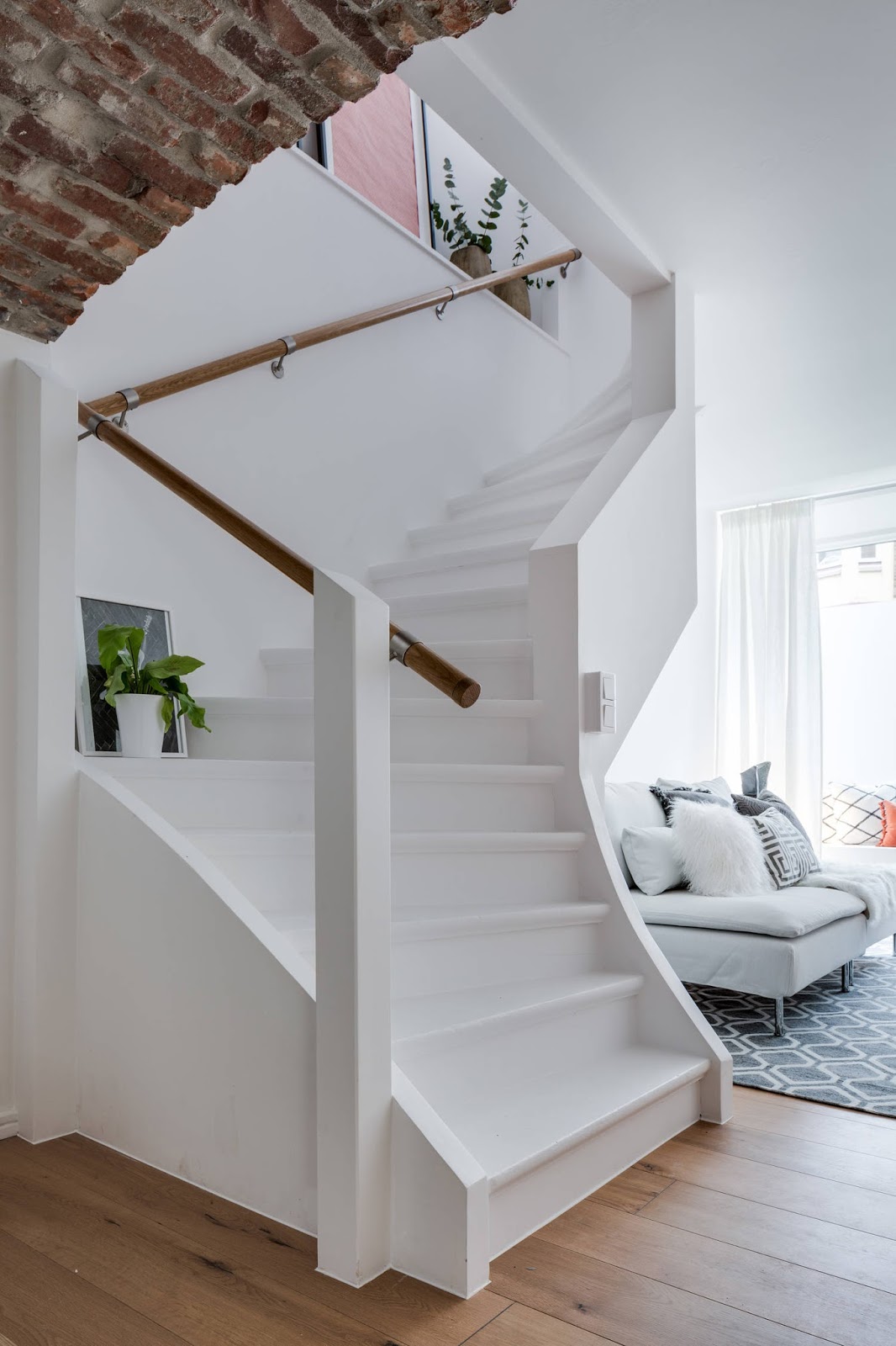 Cegła we wnętrzach wygląda świetnie, w tej realizacji duża uwagę zwracają także schody – niezwykłe!
