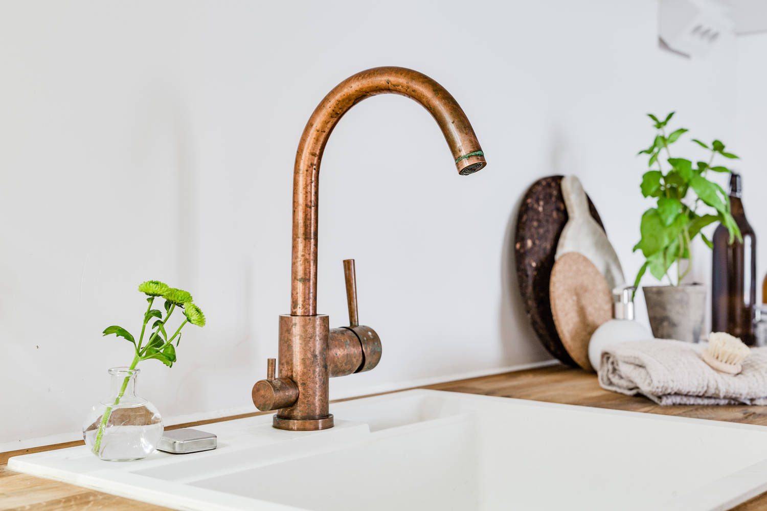 Ciekawie wygląda także bateria zlewozmywakowa w kolorze starego złota (miedzi). W zbliżonej barwie (odcienie brązu) jest także podłoga, blat oraz poręcz stylowych schodów, które prowadzą na drugi poziom mieszkania.