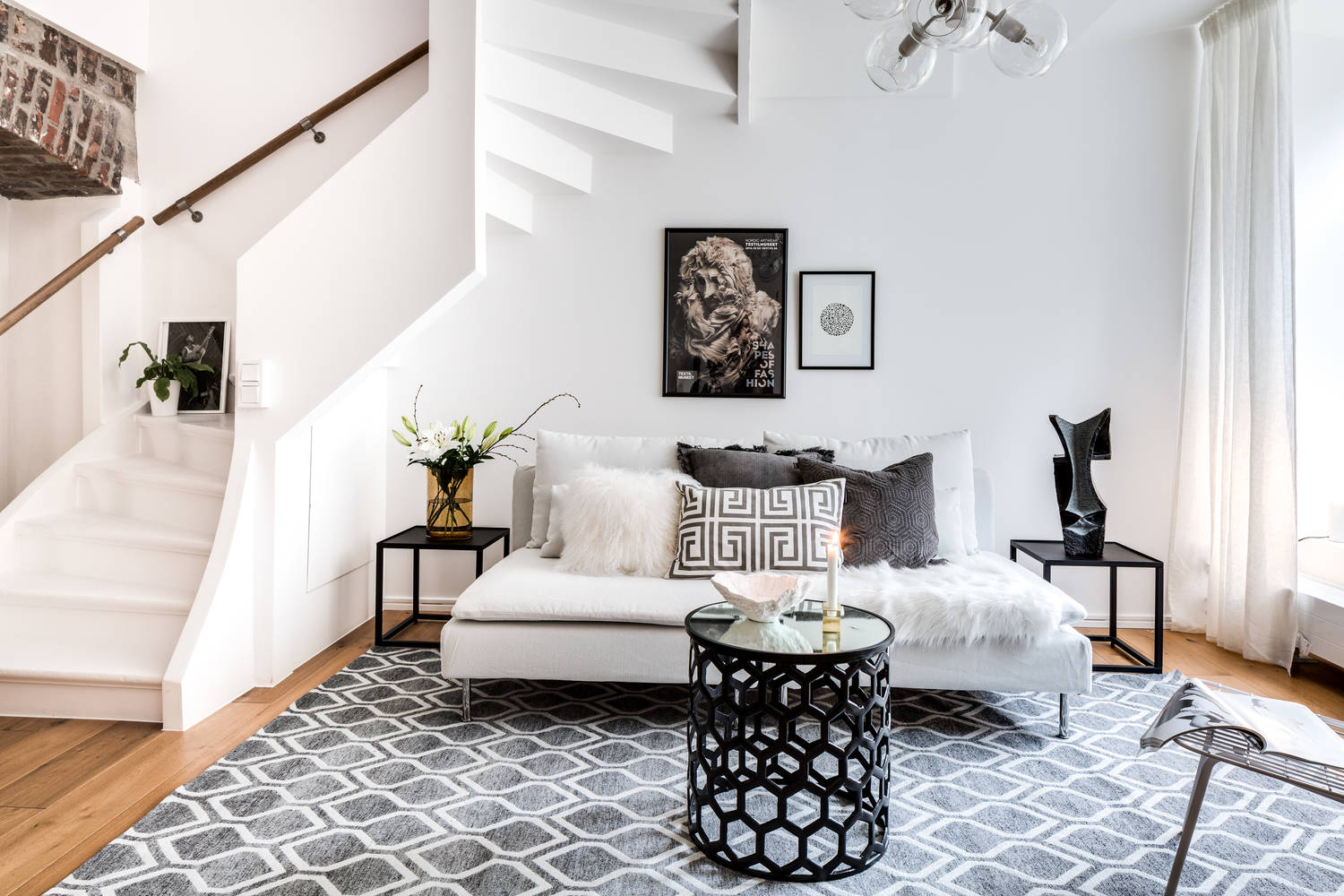Czerwień cegły świetnie kontrastuje z białym kolorem: ścian, mebli kuchennych oraz jasną szarością sofy, dywanu i czarnymi stolikami kawowymi.