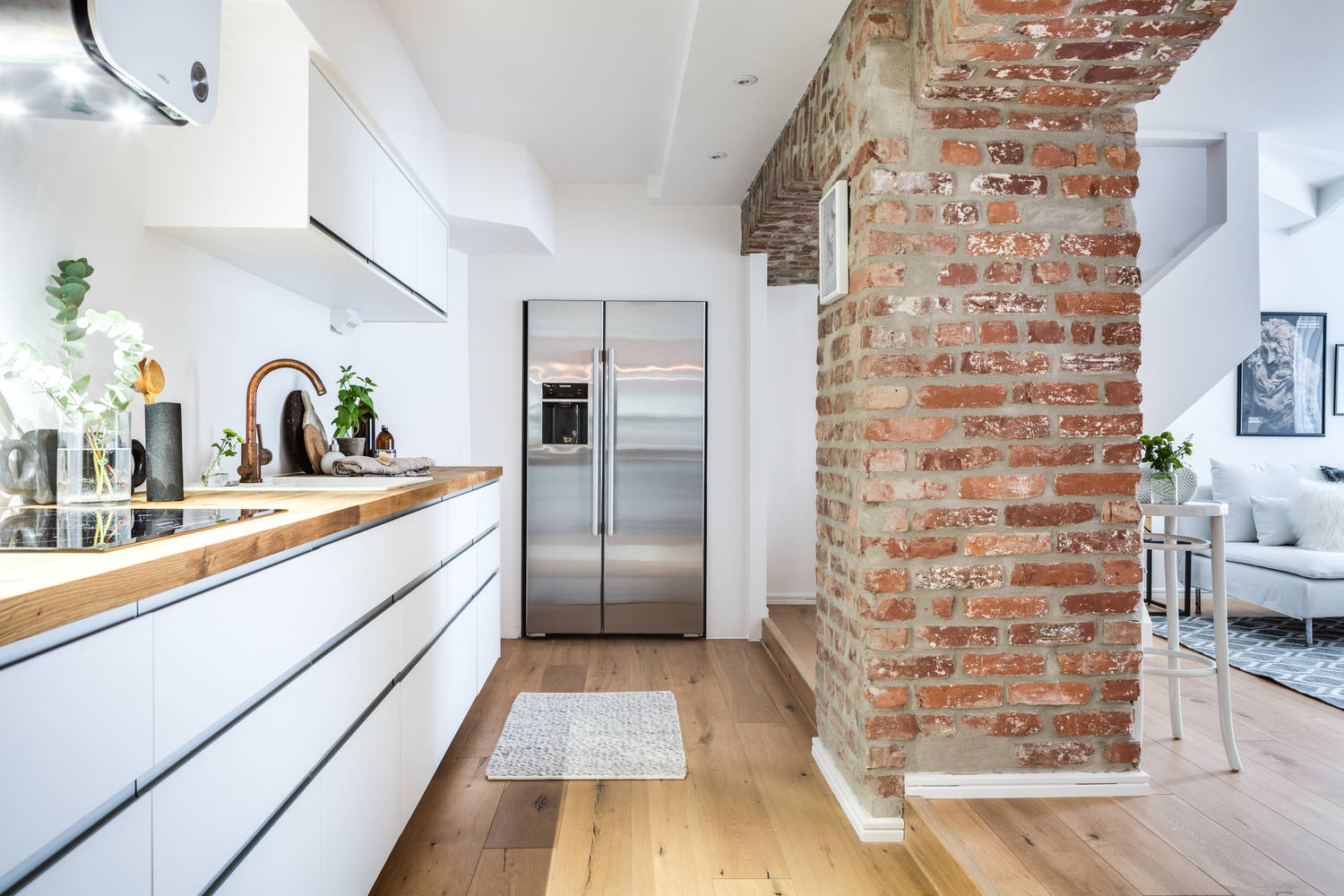 Schludnie i łądnie. Cegłą i drewniane elementy cudownie komponują się z bielą ścian i mebli.