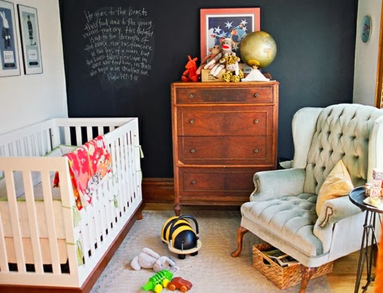 Zależy z czym zestawiamy te ciemne ściany. Na przedstawionych przez Ciebie fotkach pomysły mi się podobają bo prawie wszystko poza ścianą jest jasne. Fajny pomysł z ta farbą po której można pisać kredą – gdy maluch będzie większy – też będzie mógł sobie coś napisać:))