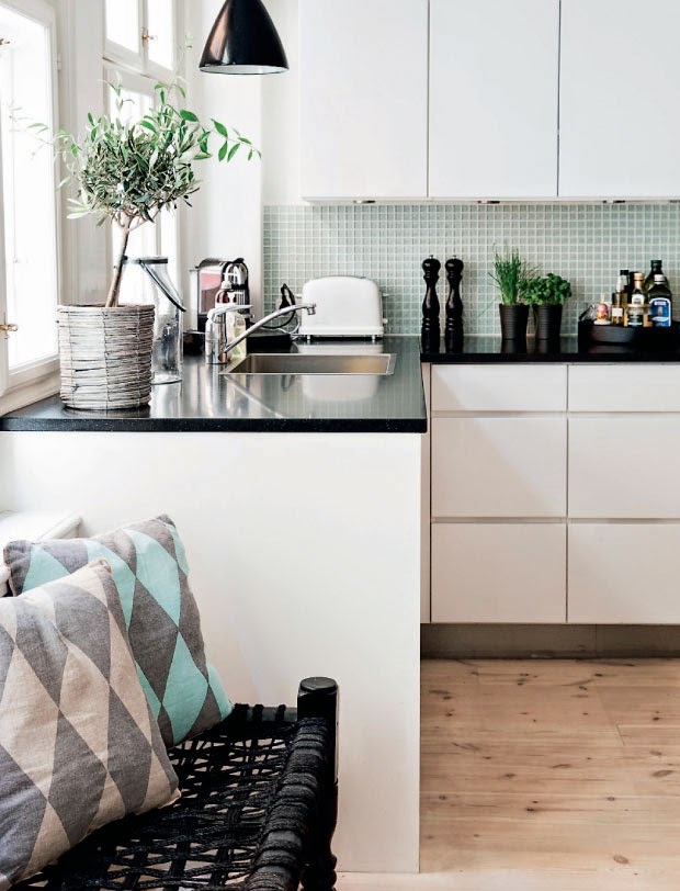 To czarno-białe mieszkanie  znajduje się w Kopenhadze, Danii. Pomimo niewielkiej liczby kolorów pozostaje bardzo przytulne. Składa się z dwóch pokoi: dziennego z aneksem kuchennym, sypialnią oraz łazienką. Ulubionym miejscem domowników jest kuchnia, a dokładnie stół, przy którym lubią wspólnie spędzać czas podczas posiłków i rozmawiać.