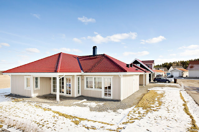 Dom położony na osiedlu domków jednorodzinnych w Szwecji. Projekt tego domu może być inspiracją dla osób lubiących domy jednopoziomowe, rozłożyste, o rozsądnej wielkości (wnętrze ma 150m2). Dla jednych może być to niewielki dom, jednak moim zdaniem w zupełności wystarczający.