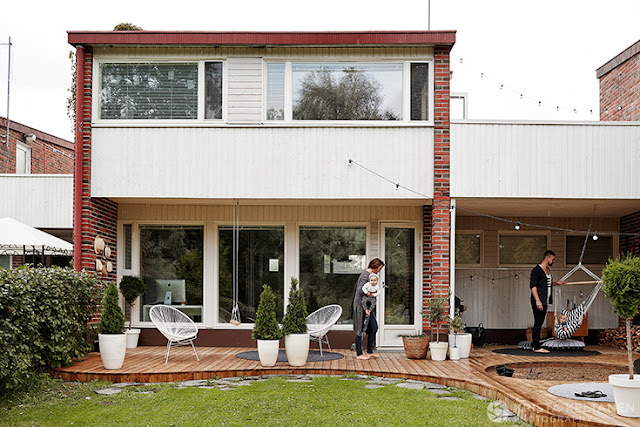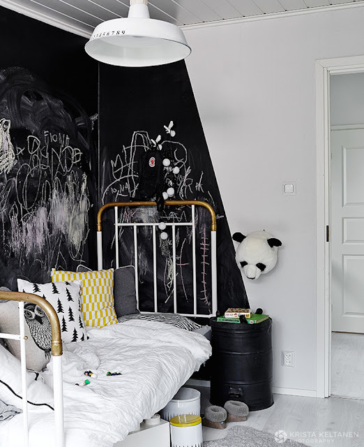 Ten dom to aranżacja tzw. skandynawskiego wnętrza, pomimo jasnych kolorów pojawia się tutaj też sporo czerni i luzu w aranżacji. Widać to szczególnie w pokoju dzieci, gdzie niczym nie ograniczona jest kreatywność małej dziewczynki na tablicowych ścianach.