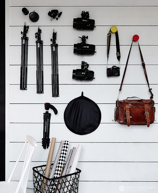 Po kreatywnej ścianie dorosłych – wyeksponowane aparaty, statywy i obiektywy, można przypuszczać, że któryś z domowników jest fotografem lub się tym pasjonuje!