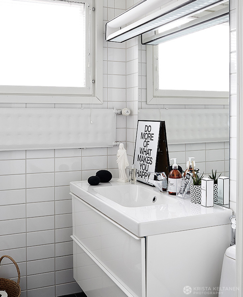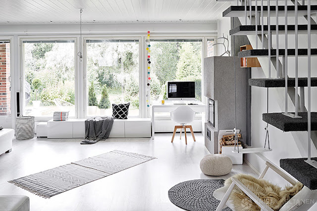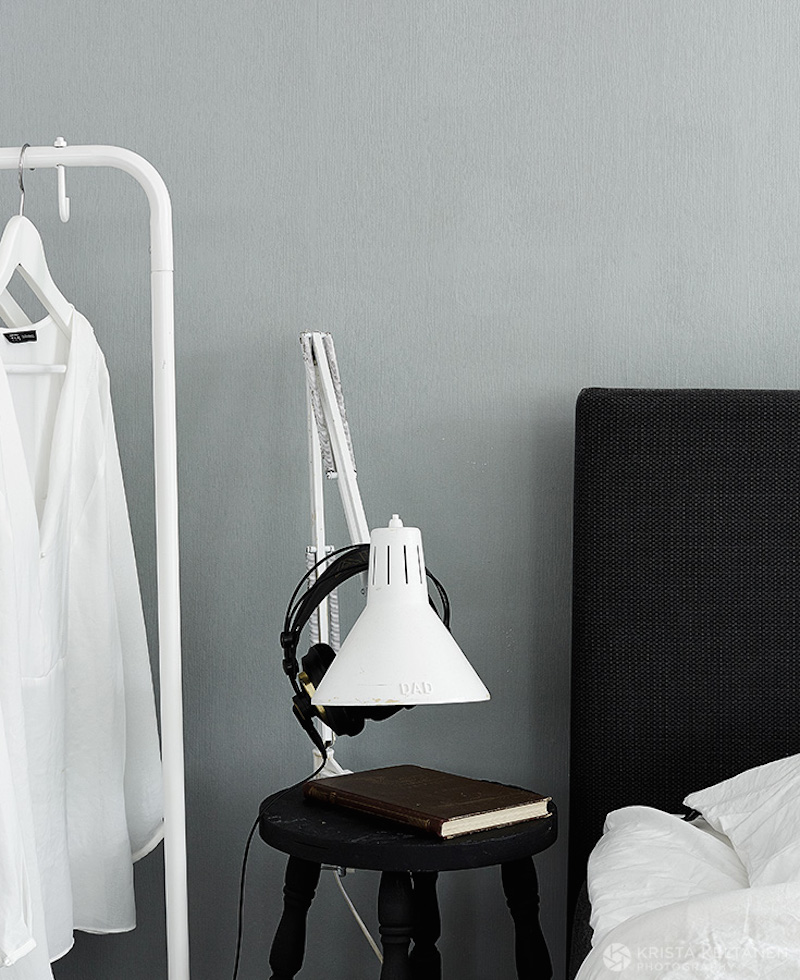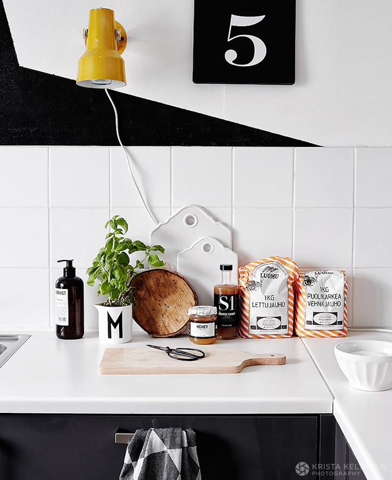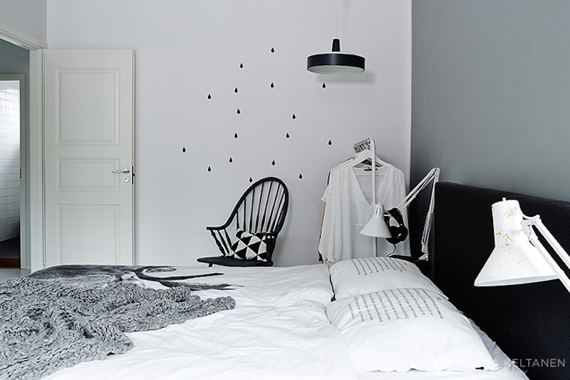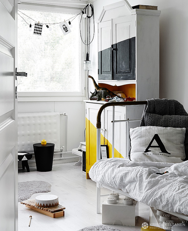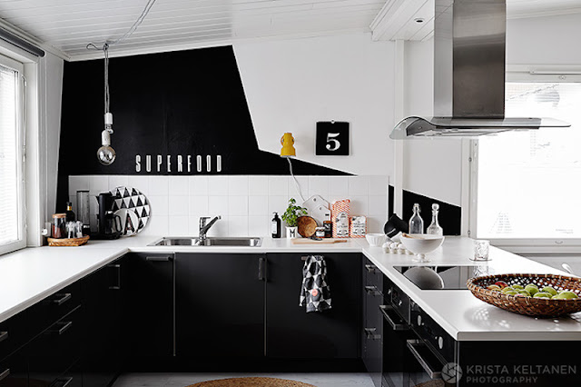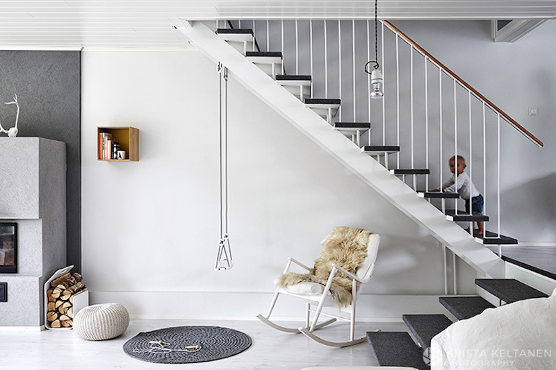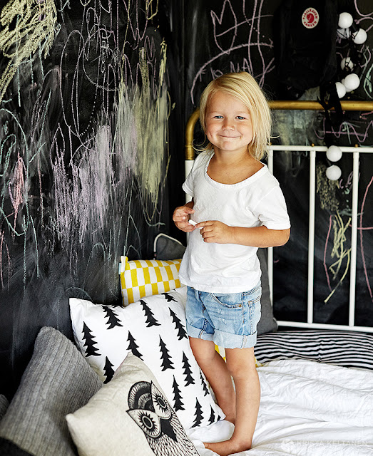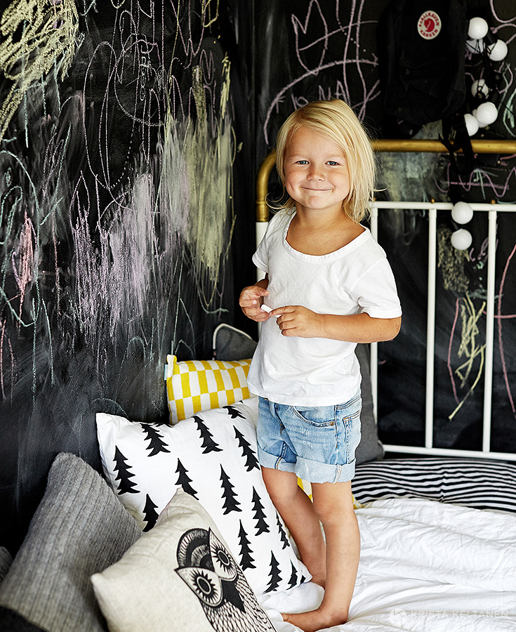 Ten dom to aranżacja tzw. skandynawskiego wnętrza, pomimo jasnych kolorów pojawia się tutaj też sporo czerni i luzu w aranżacji. Widać to szczególnie w pokoju dzieci, gdzie niczym nie ograniczona jest kreatywność małej dziewczynki na tablicowych ścianach.