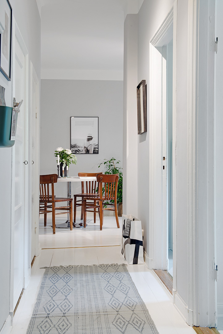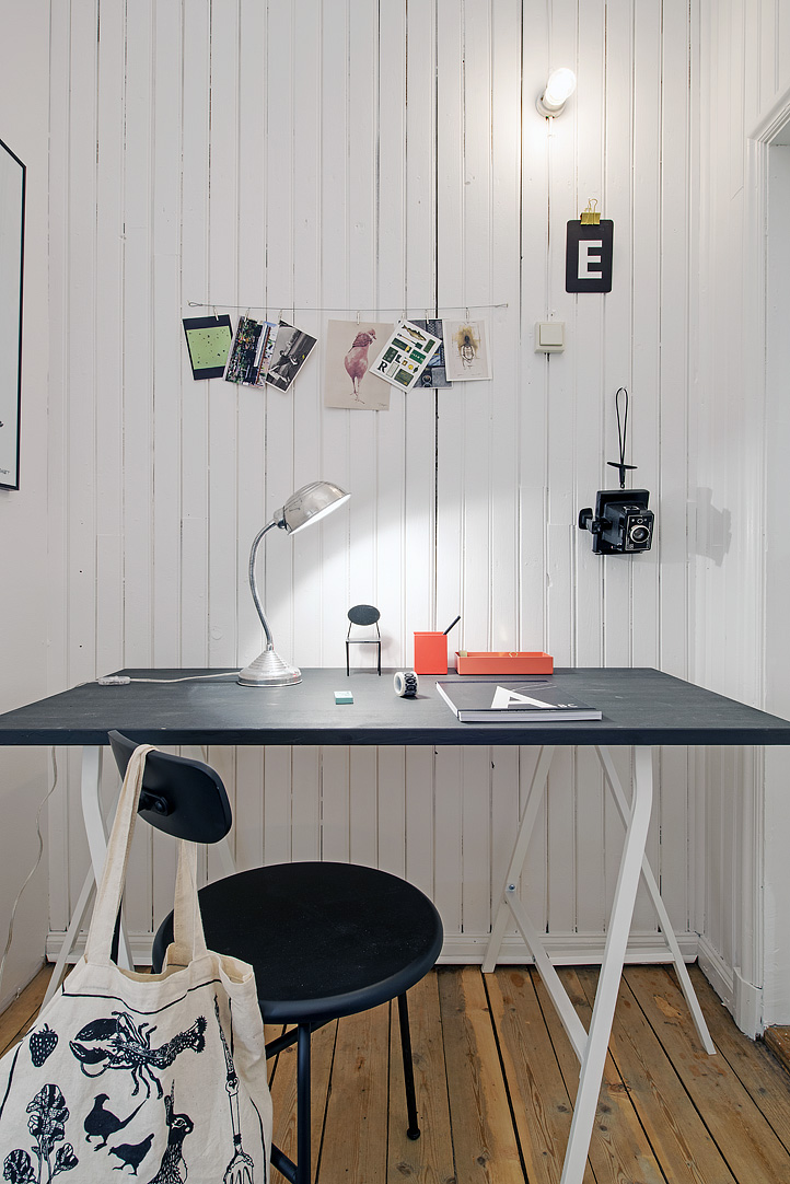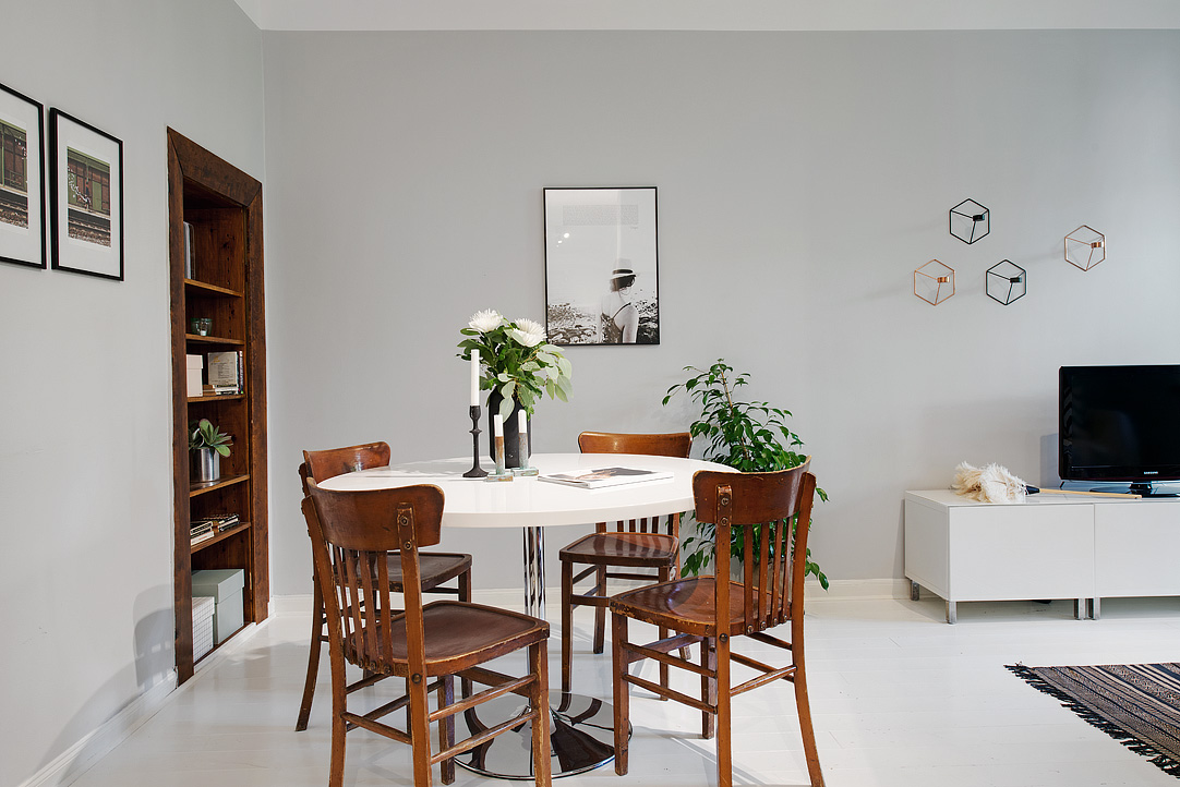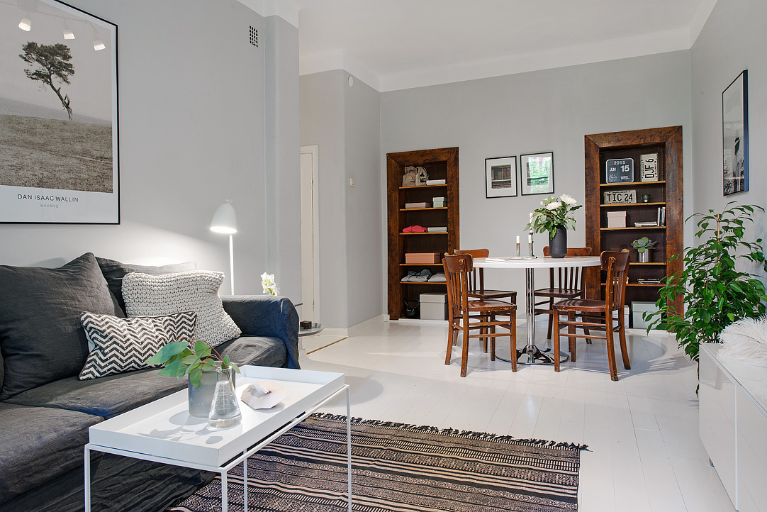 Dwupokojowe mieszkanie o powierzchni 48m2. Położone na pierwszym piętrze budynku. Pokój dzienny połączony z jadalnią. Ciekawą ozdobą są regały wbudowane w ścianie we wnękach z ciemnego drewna. Drugi pokój to sypialnia. Przestrzeń mieszkania wypełnia także kuchnia, łazienka i korytarz. Całość w skandynawskim stylu.