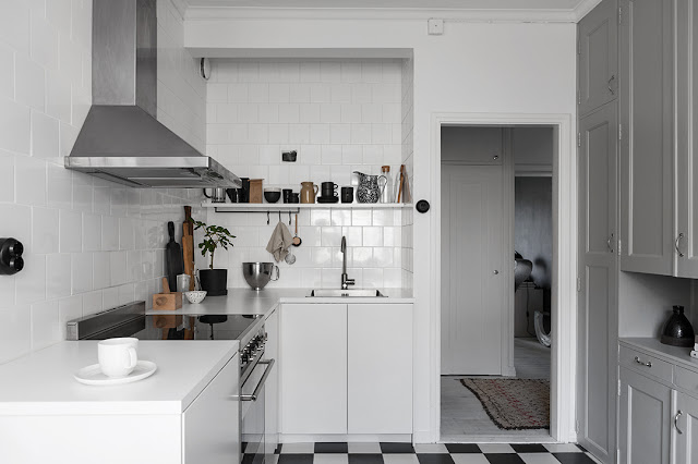 Sypialnia niewielka, z przewagą bieli. Mieszkanie to zostało urządzone w skandynawskim stylu, znajduje się w szwedzkim mieście Gustavsplatsen.