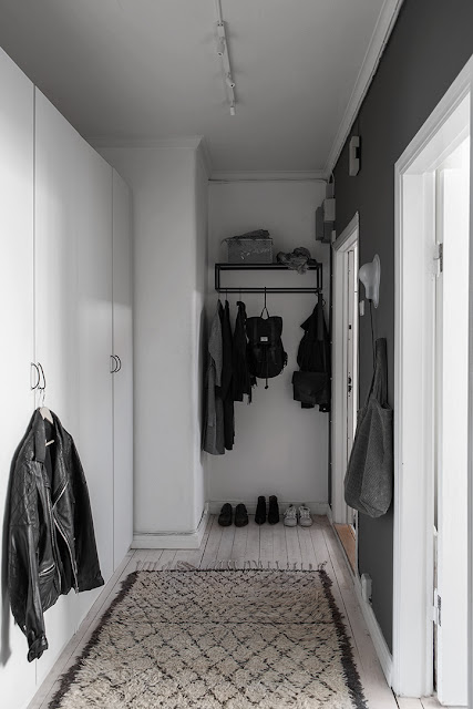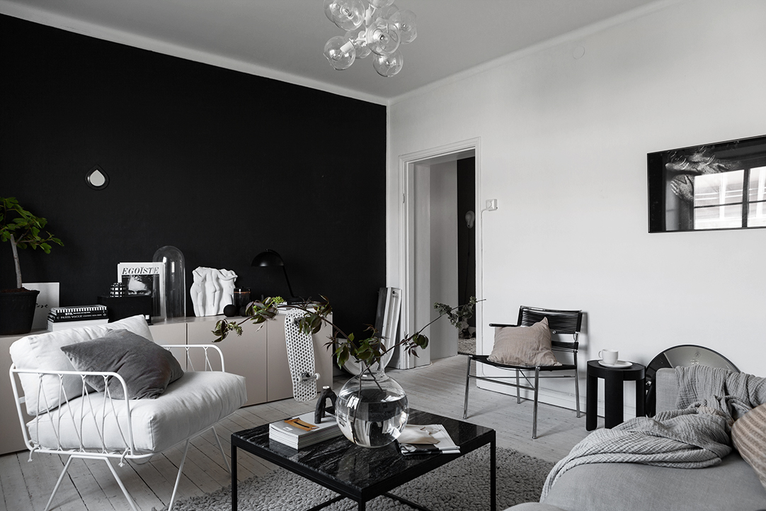 Dwupokojowe mieszkanie o powierzchni 49m. Dominują tutaj kolory:biel, szarość i czerń. Pokój dzienny to szara sofa, miękkie poduszki i pled, fotel, szafka niska (komoda, a’la rtve ale nie ma telewizora). Co ciekawe ściany zostały pomalowane na dwie kontrastowe barwy, podłoga jasna bielona drewniana.