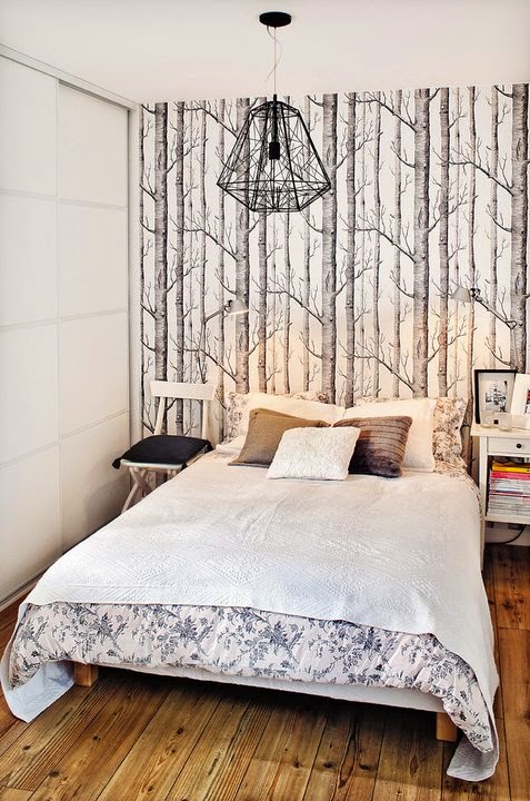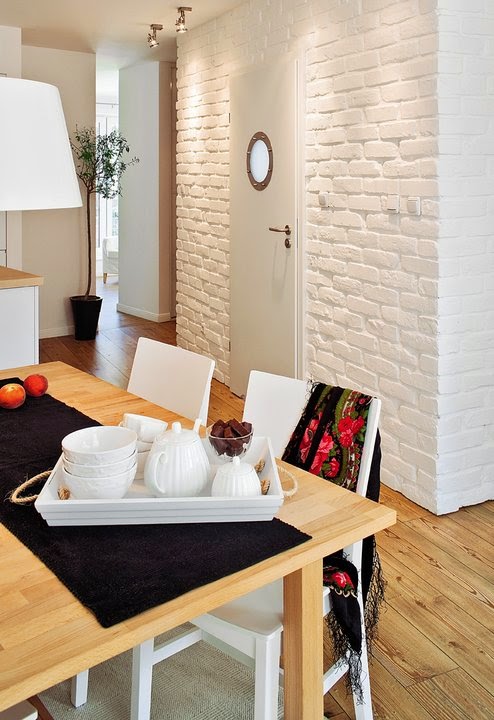 Bazę stanowi kolor biały, przełamany fakturą  cegły na jednej ścianie oraz tapetą w sypialni. Właściciele lubią meble z sklepu Ikea, dlatego zakupili tam sofę wraz z podnóżkiem. Przekonała ich także możliwość zdejmowania pokryć na mebel, teraz mają szare pokrycie na jesien i zimę, a na lato sofę odmieniają na biało.
