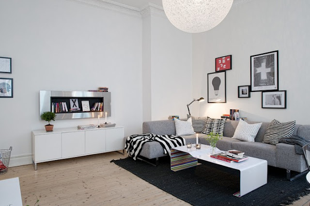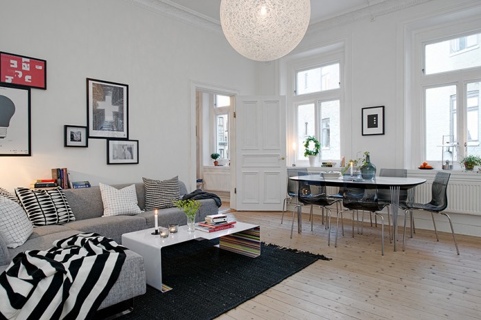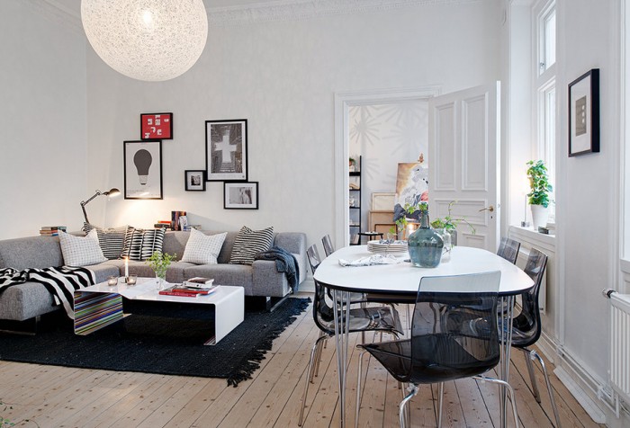 Przestronne dwupokojowe mieszkanie w skandynawskim stylu. Wnętrze w swojej aranżacji łączy stare i nowe przedmioty. Salon to duża szara sofa, biały stolik przed nią, na podłodze ciemno szary dywan. Nad sofą powieszono obrazki w czarnych ramach. Na ścianie obok sofy umieszczono komodę, a nad nią ciekawą półkę. Z drugiej strony stół z sześcioma krzesłami z czarnego tworzywa.