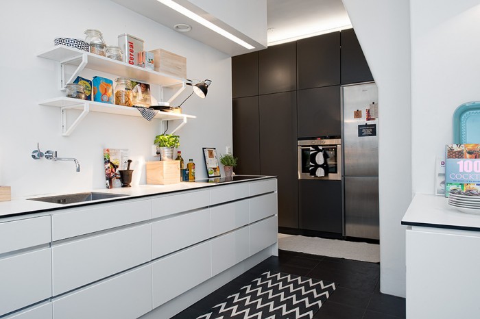 Kuchnia nowoczesna z przewagą bieli. Przeważają białe szafki kuchenne, jedynie na jednej ścianie zamieszczono grafitowe szafki w zabudowie. Stół kuchenny niewielki, a na przy nim stoją czerwone stołki – taborety. Kolor do kuchni wprowadzają dodatki i żywność: obrazki, zioła, oliwa, kolorowe pudełka. Z kuchni można przejść do jadalni połączonej z salonem.