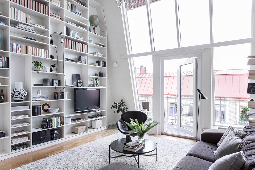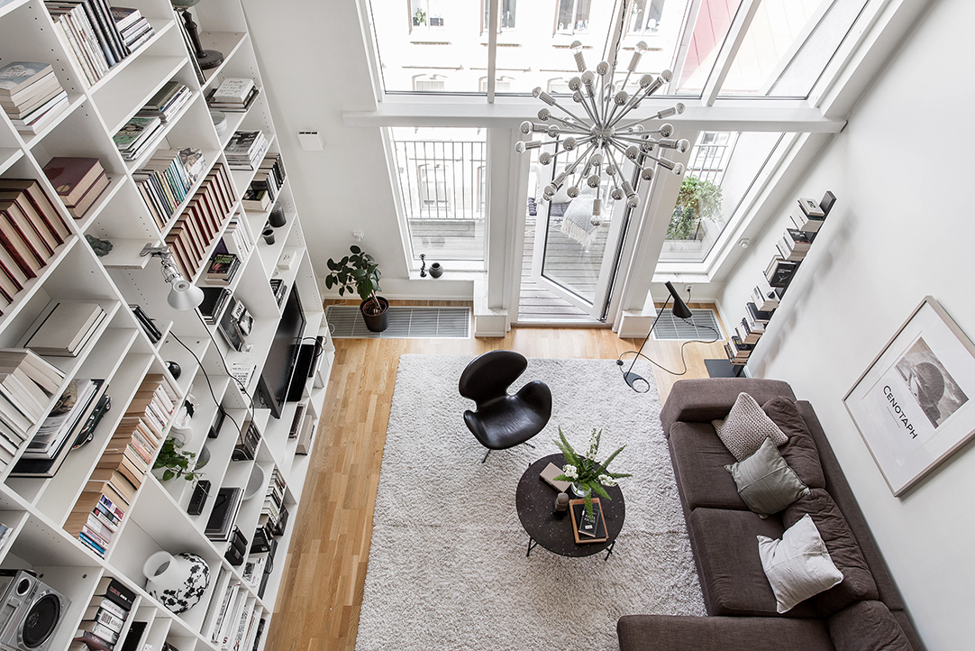 Skandynawskie mieszkanie dwupoziomowe o powierzchni 96m2. Wysoki pokój dzienny z dużymi oknami oraz ściną wypełnioną do sufitu półkami z książkami.