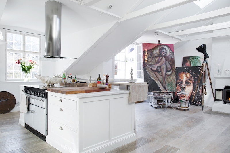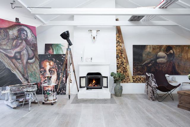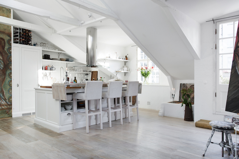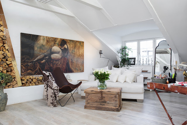 To mieszkanie jest położne na ostatnim piętrze szwedzkiego budynku. Salon ma aż 4 metry wysokości! Ten pokój łączy ze sobą przestrzeń dzienną, z kuchnią i jadalnią (na wyspie). Ozdobą wnętrza są także duże kolorowe obrazy na płótnie. Być może właściciel jest artystą (przy jednym obrazie widać schodki, których używają artyści- malarze do pracy) lub koneserem sztuki!