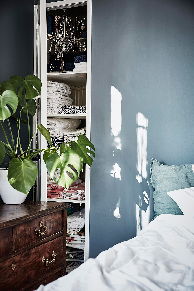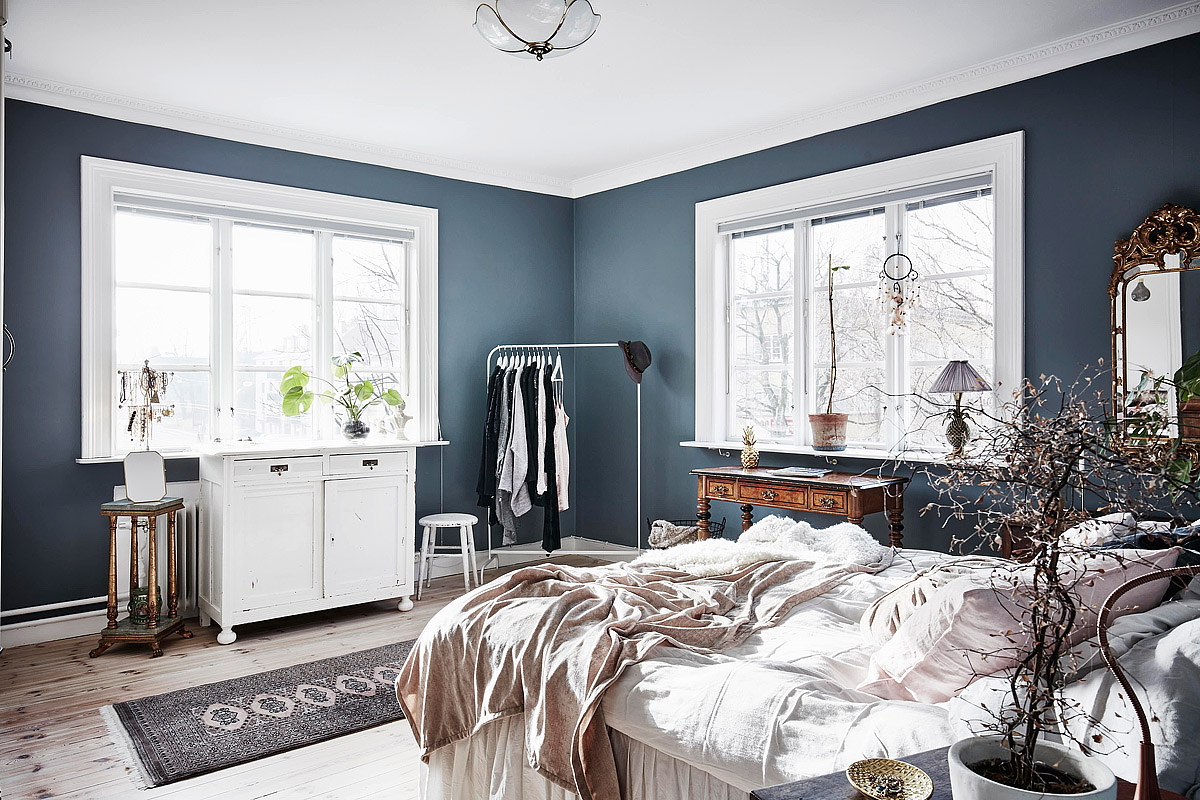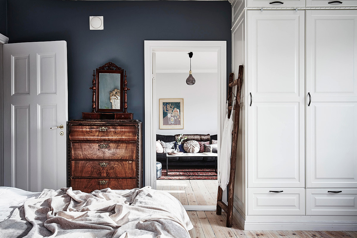 W tej sypialni, aby zapobiec błędom aranżacyjnym granatowe ściany połączono z białymi i drewnianymi meblami, jednak zwróćcie uwagę, że meble są także osobliwe, zdobione, z charakterem. Takie same są obrazki nad łóżkiem, być może to rodzinna pamiątka lub „wygrzebane” z antykwariatu. Lubicie taki unikatowy styl?