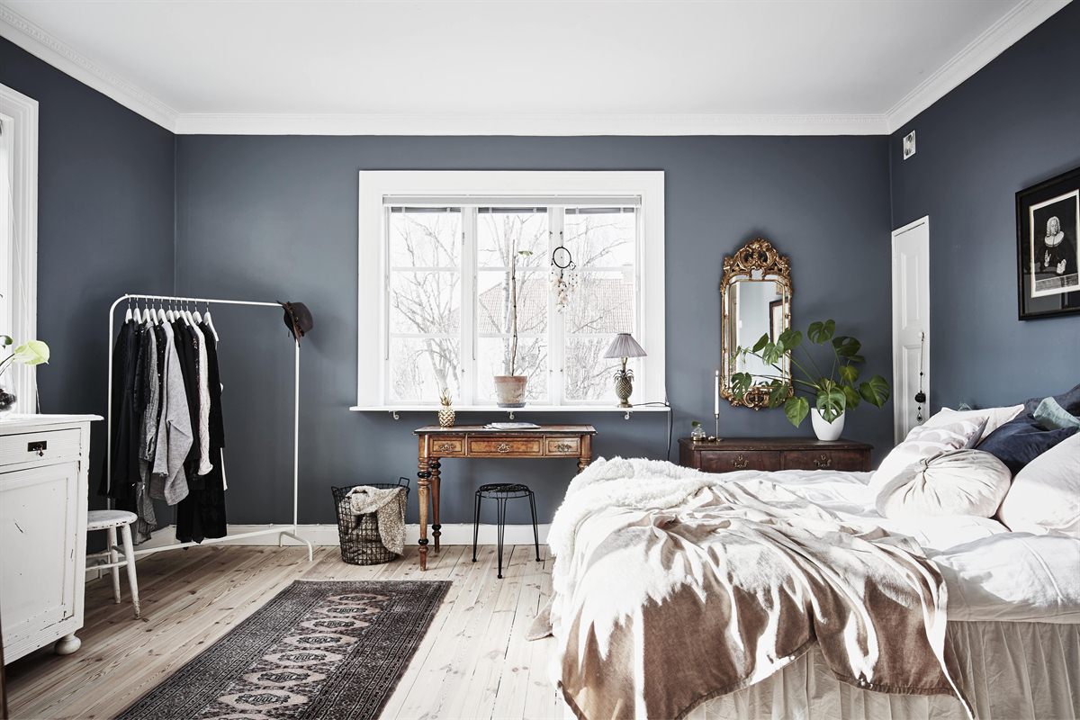 Kolorowe ściany potrafią zdziałać tak wiele w pomieszczeniu. Oczywiście należy dopasować kolor do całości ale w tym przypadku granat pasuje idealnie. Cała sypialna jest urządzona rewelacyjnie.