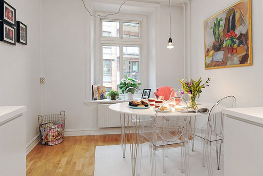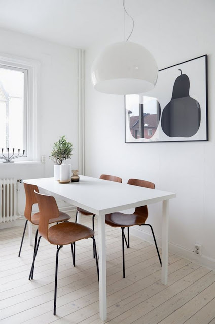 Jaka jest jadalnia wskandynawskim stylu? To często stół z krzesłami postawiony w pokoju dziennym lub kuchni. Może być drewniany, malowany na biało, kwadratowy lub okrągły. Krzesła są najczęściej drewniane lub plastikowe, w jednym kolorze lub każde inne. Coraz częściej w aranżacjach w skandynawskim stylu spotykam krzesła projektu Charles Eames (takie jak zdjęcie nr 2 i 3). Jest to klasyk designu, więc można sądzić, że ich użytkownicy znają się na wnętrzarskiej modzie!