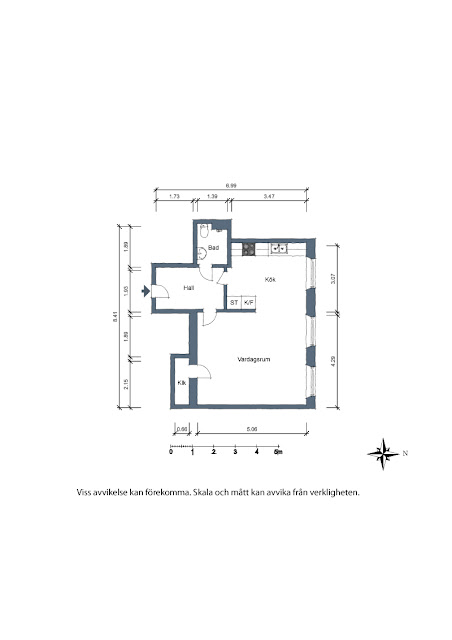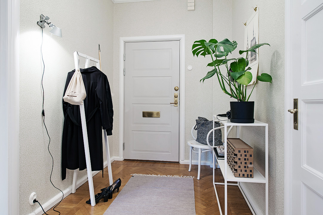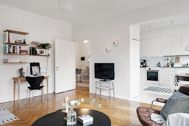 Skandynawska kawalerka o powierzchni 45m2. Mieszkanie znajduje się na ostatnim piętrze budynku, dzięki temu wnętrze jest dobrze nasłonecznione. Charakter otwarty pomieszczeń, wygląda jakby wyburzono ścianę pomiędzy kuchnią, a pokojem dziennym. Oprócz sofy wstawiono także łóżko. Z pokoju przechodzi się do małej garderoby, z drugiej strony do kuchni urządzoną z przewagą białej barwy: szafki, podłoga, krzesła.