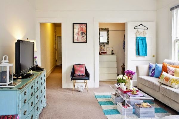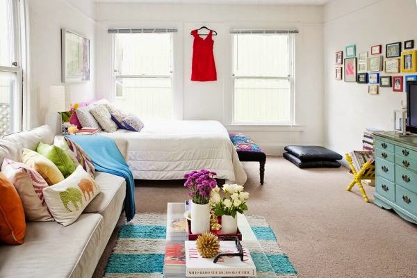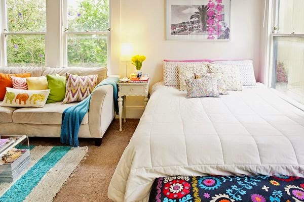 Mieszkanie ma 42m2 powierzchni i jeden pokój. Jest to tzw. kawalerka położona w San Francisco. Wynajęta przez kobietę, która urządziła tu przytulne gniazdko. W pokoju znajduje się zarówno przestrzeń dzienna, jak i sypialnia. Dodatkowo we wnęce pokoju jest umieszczone pomieszczenie, wydaje mi się, że jest to garderoba z toaletką, prawdziwe królestwo kobiety 😉 Pokój dzięki doborom kolorów w dodatkach wydaje się niezwykle przytulny i wielobarwny. Przy wejściu pewnie mamy kuchnię i łazienkę, gdyż z perspektywy pokoju widać długi korytarz.