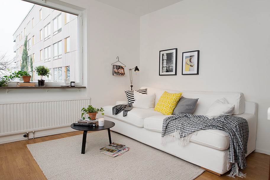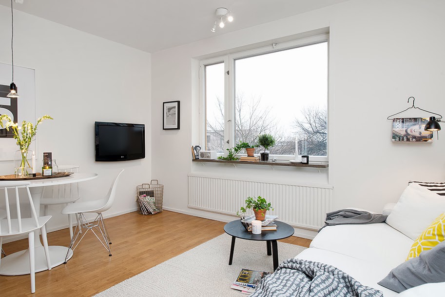 Mieszkanie znajduje się w Szwecji, stanowi inspirację urządzenia kawalerki z aneksem kuchennym. Wnętrze jest jasne i mimo niewielkiego metrażu wydaje się przestronne. Urządzone w tylu skandynawskim, choć szafki kuchenne są w ciemnym kolorze – co jest rzadko spotykane w inspiracjach wnętrzarskich tego typu.