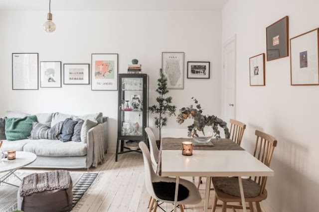 - minimalna ilość mebli, za to wnętrze ocieplają dodatki: obrazki w czarnych ramach