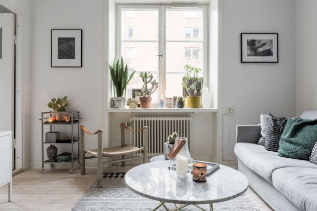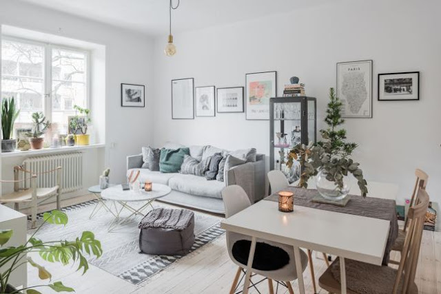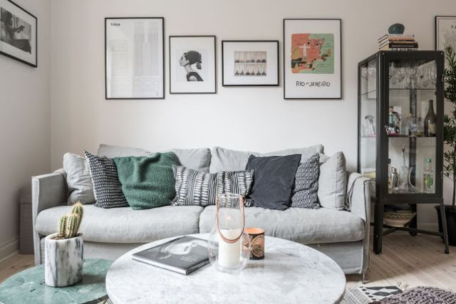 - minimalna ilość mebli, za to wnętrze ocieplają dodatki: obrazki w czarnych ramach