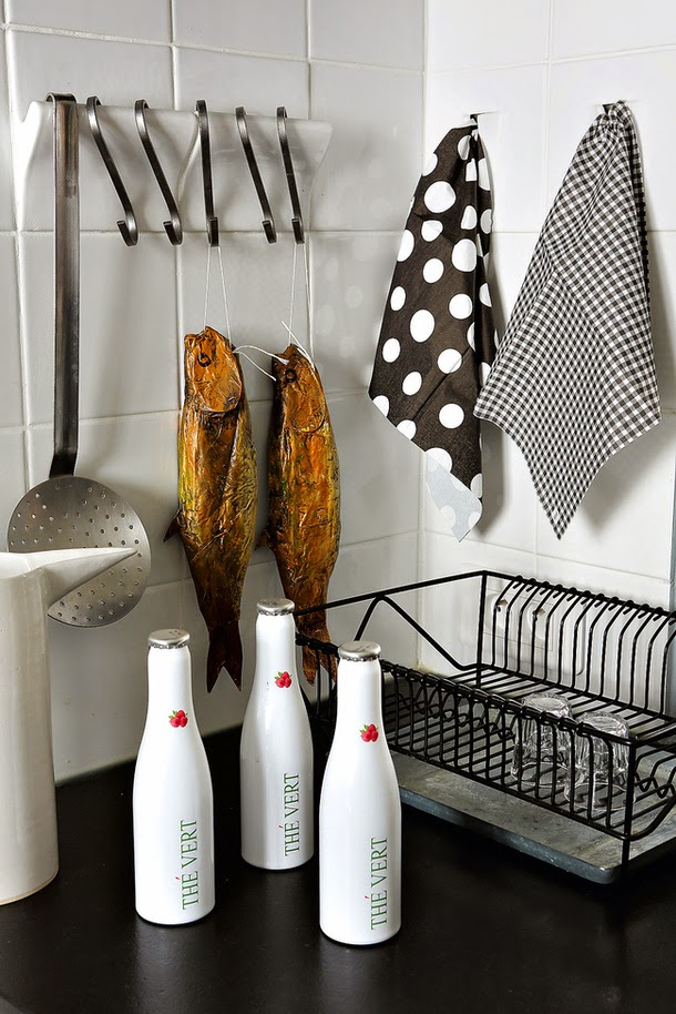 Całe mieszkanie jest cacuszkiem!!, ale najbardziej podoba mi się stoli z walizek 🙂 i dwie wiszące ryby w kuchni 😉 😉