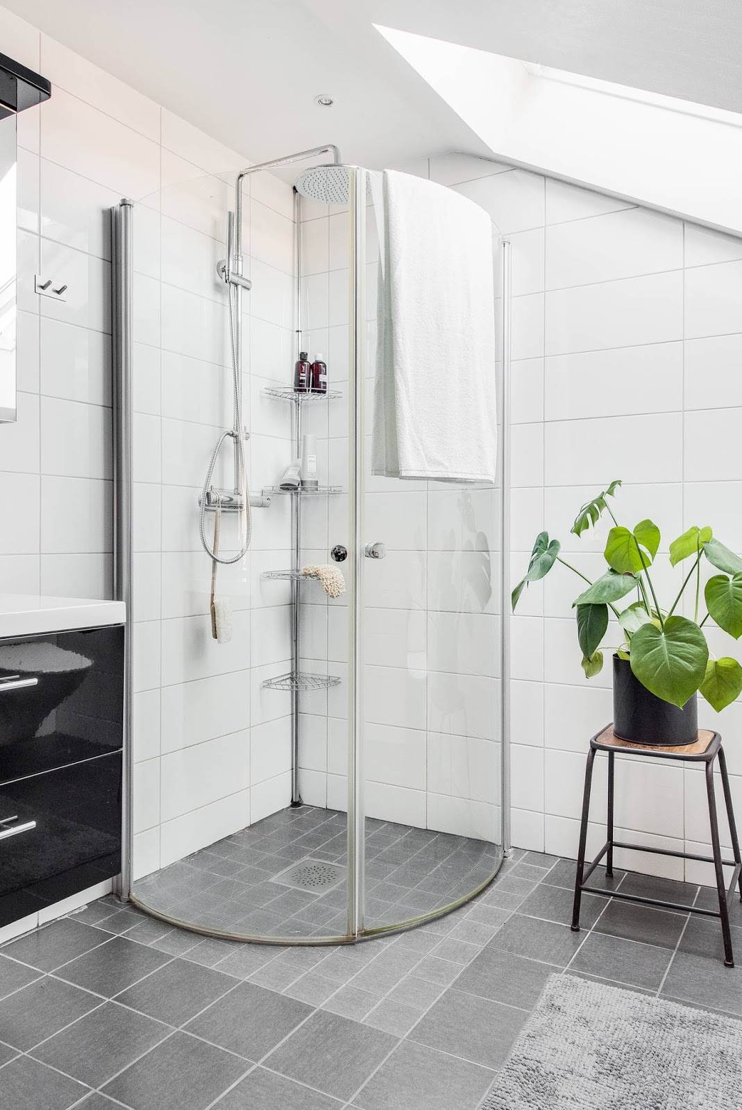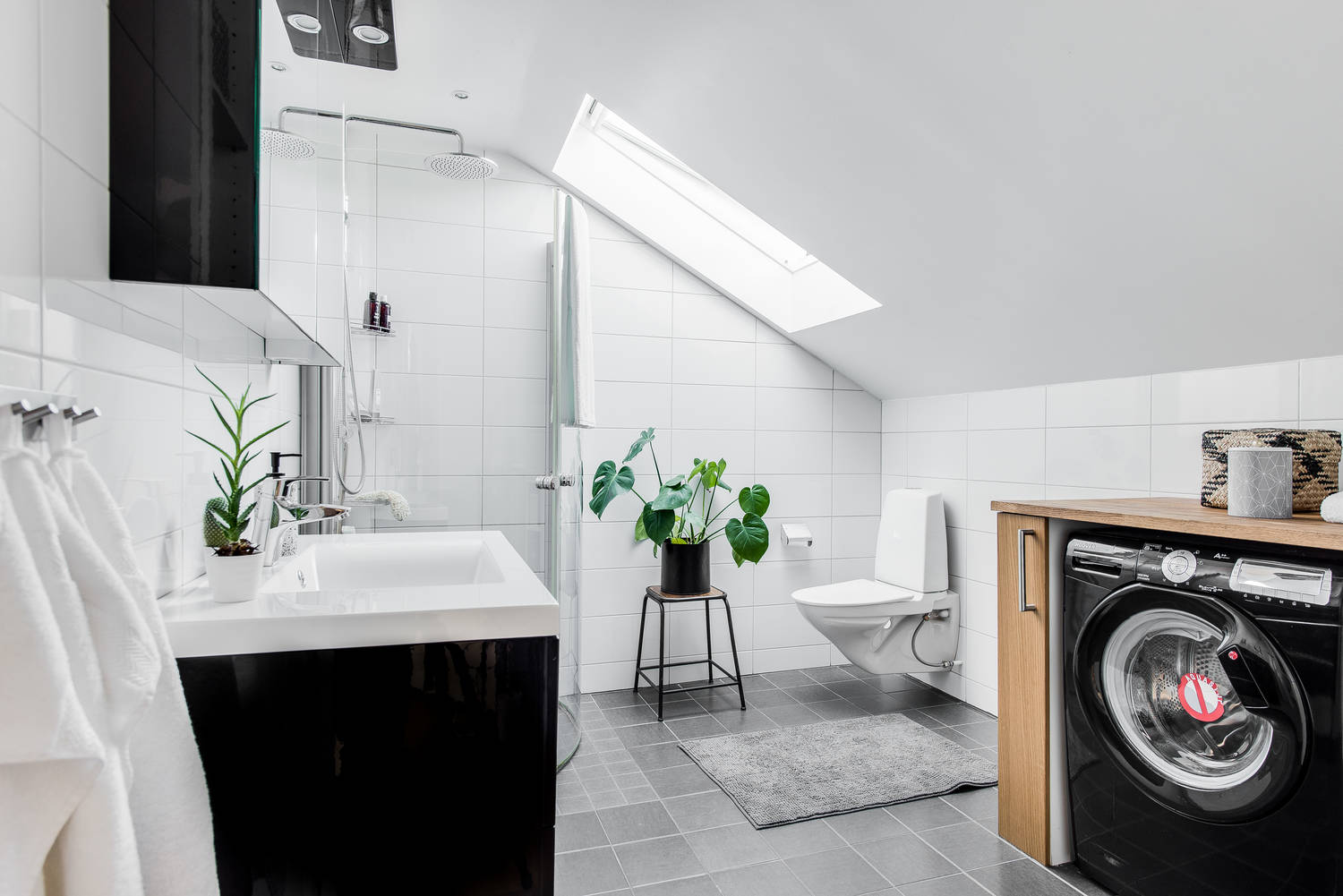 szafki nad lustrem oraz sprzętu rtv. Pralka i suszarka zostały ładnie wkomponowane pod blat. W łazience zamontowano okno dachowe i dzięki temu, że jest dostęp do naturalnego światła pomieszczenie zdobią rośliny.