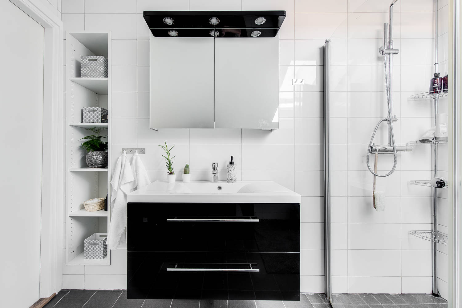 Na uwagę zasługuje dobór kolorów w łazience, a raczej czarne wykończenie: szafki pod umywalką,