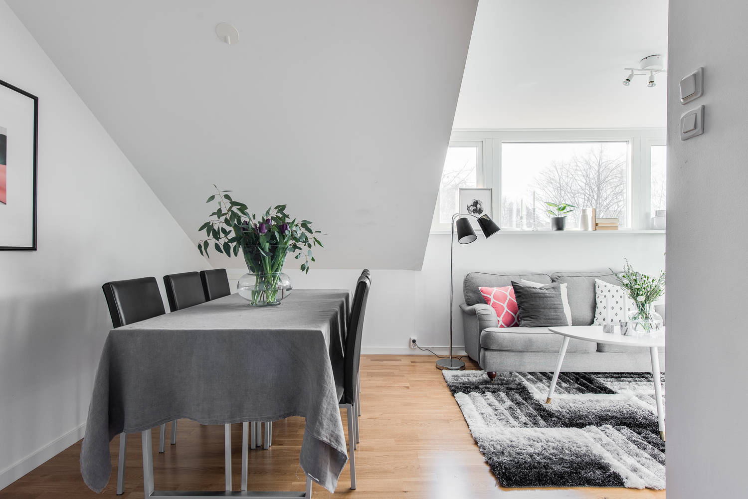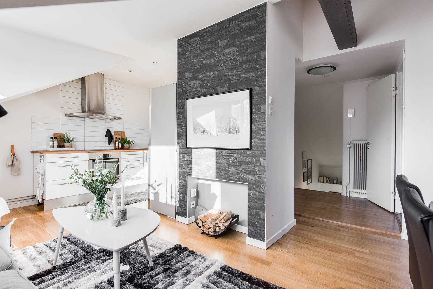 mieszkanie urządzone rewelacyjnie ! W ogóle nie zauważa się tych skosów , a dzięki kolorystyce i otwarciu kuchni na salon ma się wrażenie że mieszkanie ma większy metraż .