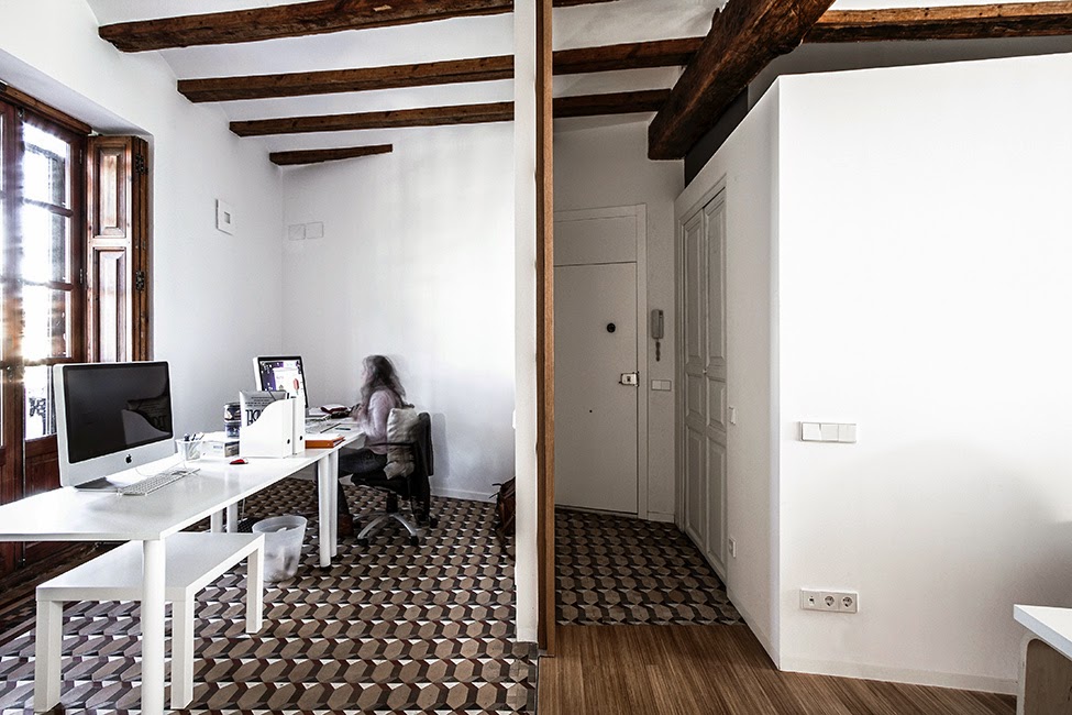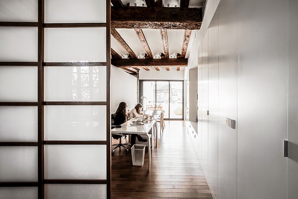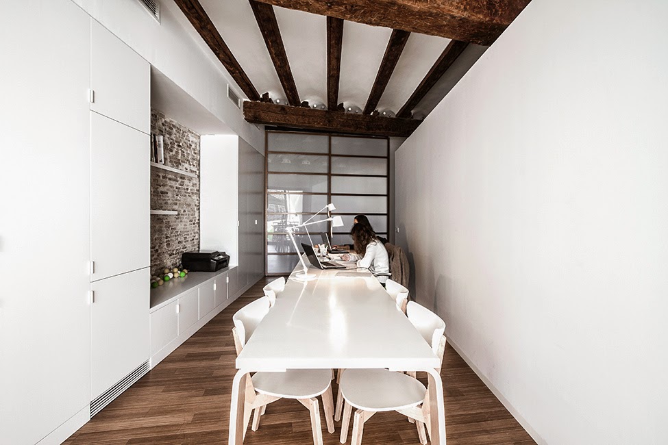 To nowoczesne biuro – pracownia architektoniczna znajduje się w Hiszpanii. Jest urządzone w minimalistycznym stylu. W celu zachowania porządku umieszczono w biurze pojemne szafy. Dodatkowym atutem jest taras, by w przerwie od pracy odprężyć się. Wnętrze wyposażone jest w aneks kuchenny oraz łazienkę, w której (nietypowo jak na biuro) jest nawet wanna.