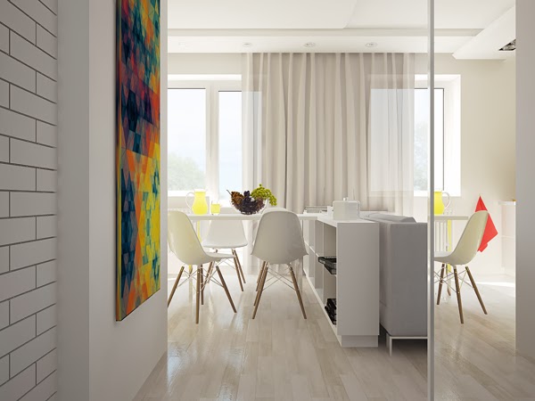 Dzisiejsza propozycja to nowoczesne mieszkanie o powierzchni 40m2. Wnętrze zostało zaprojektowane przez białoruskie studio projektowe Next Design. Jest to projekt wnętrza typu open space (po raz kolejny, takie wnętrza sa coraz modniejsze :)), utrzymany w jasnej tonacji kolorystycznej z dodatkiem żywych kolorów. Dla podkreślenia nowoczesnego charakteru dodano designerskie gadżety: krzesła, figurka ptaszka i komputer iMac.