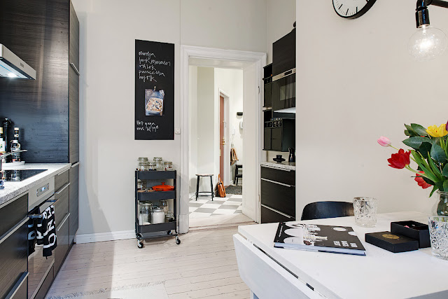 Tą inspiracje odnalazłam specjalnie dla sympatycznej pani Małgosi (którą pozdrawiam), bo zgłosiła się do mnie z pytaniem o aranżację jej pokoju dziennego wraz z jadalnią. Ten pokój nie jest bardzo duży, a pomimo to spełnia funkcje dzienną, wypoczynkową oraz jadalni. Nieużywany piec kaflowy z powodzeniem służy jako miejsce na świece, a moją uwagę zwróciła ściana, na której jest zamontowany tv. Obok powieszono półki, skrzynki, które z pomysłem wypełniono. Z pokoju dziennego przechodzi się do sypialni w bardzo podobnym klimacie, a z niej do małej garderoby. W mieszkaniu jest też kuchnia, łazienka i przedpokój. Szafki kuchenne są czarne, za to stół biały i te same półeczki – szynie co w salonie zdobią przestrzeń! Korytarz zdobią szafy z Ikea, ale co nietypowe nie ma drzwi zewnętrznych. Podoba się Wam takie wnętrze?